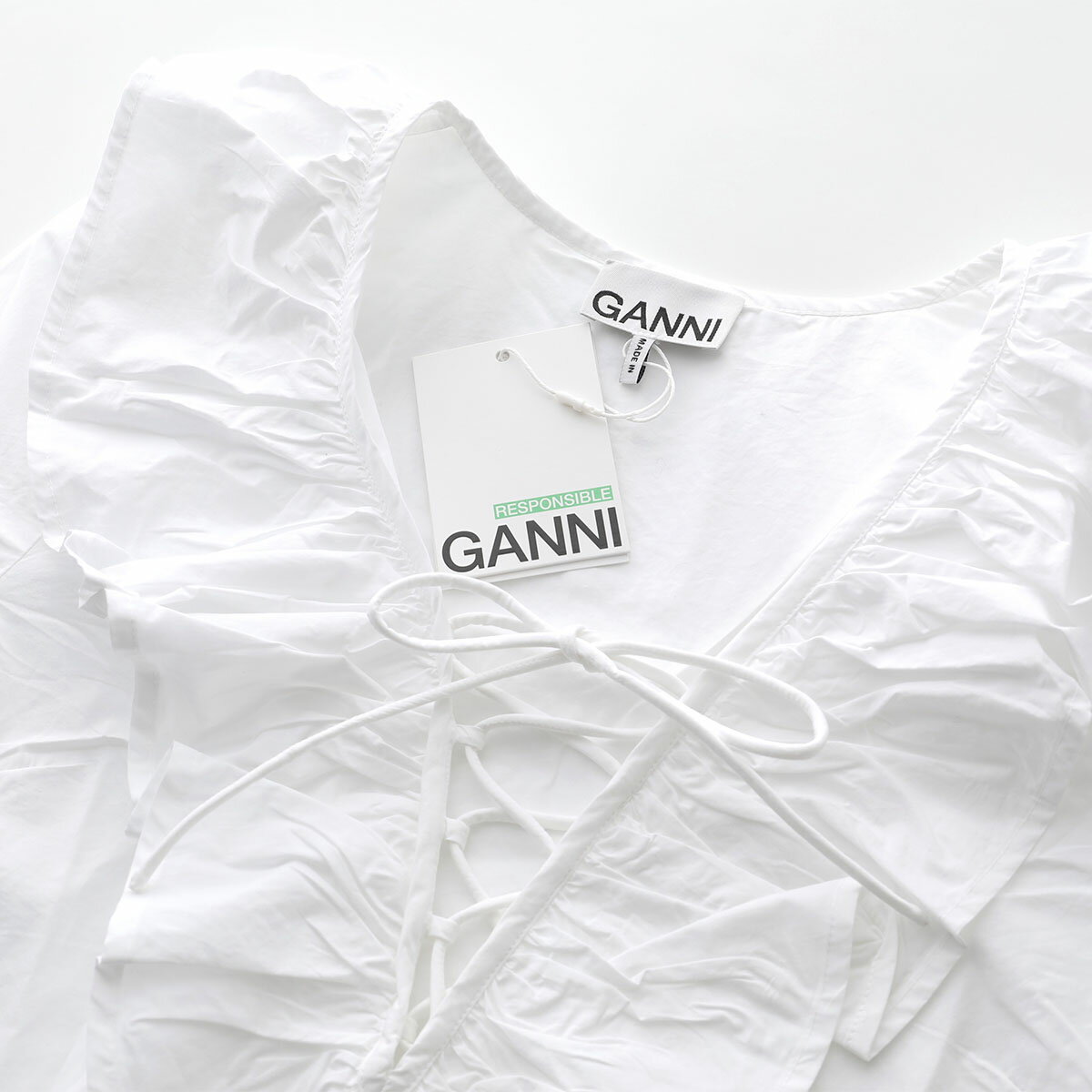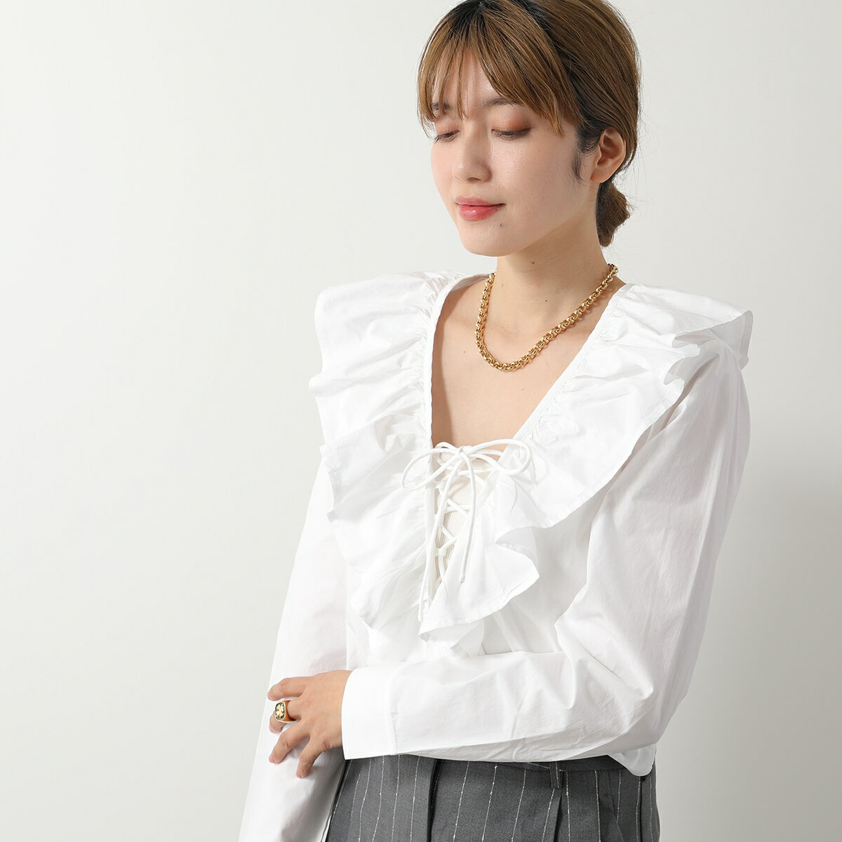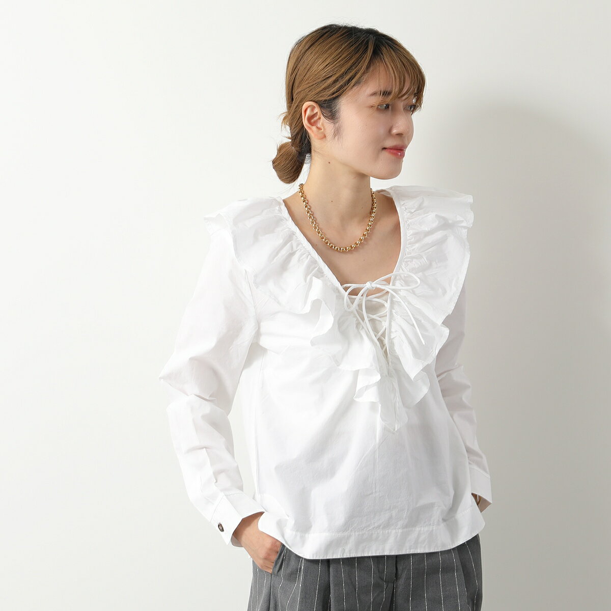 GANNI ガニー ブラウス Cotton Poplin Ruffle V-neck Blouse F8701 6479 レディース フリル Vネック 長袖 151/Bright-White【po_sannn】