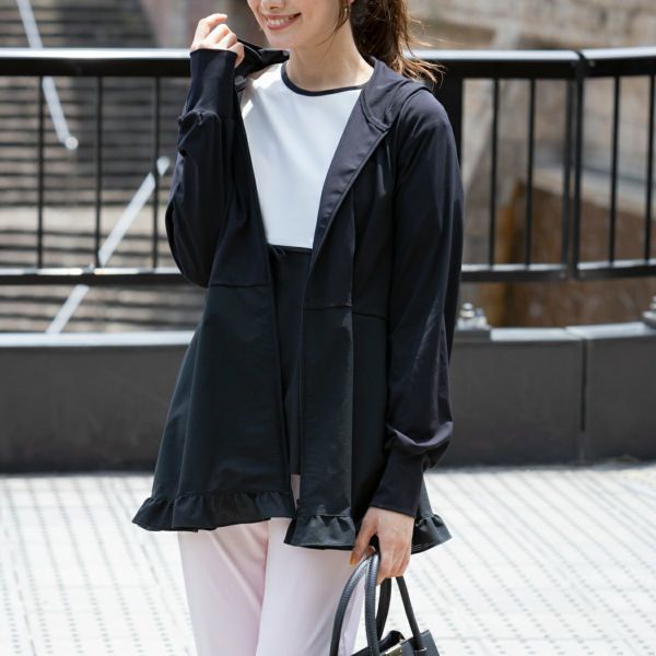 【5/29~6/1限定ポイント3倍】SONO ソーノ ラッシュガード S242JV027 レディース フーディ UVカット ティアード フリル ストレッチ ジップアップ パーカー 長袖 チュニック丈 19/BLACK【po_sannn】
