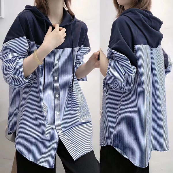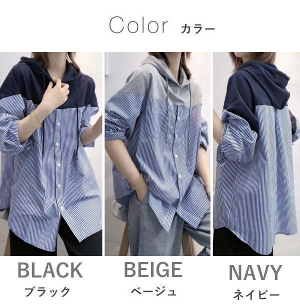パーカー チュニック シャツ パーカー レディース フード付き ストライプ シャツブラウス 大きいサイズ ドロップショルダー 異素材 切り替え バイカラー ドッキング 長袖 バルーンスリーブ 体型カバー レイヤード風 通勤 OL シンプル 春 冬 秋(アパレル)