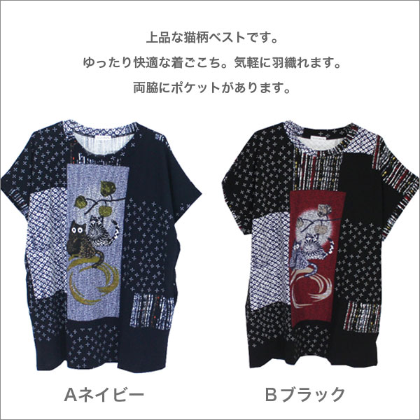 ネコ柄ベスト 婦人服 ミセス ハイミセス シニア ファッション 女性 通販 店 ネット通販 ネットショップ プレゼント 衣料 衣類 服 洋服 祖母 おばあちゃん 高齢者 レディースファッション レディース 春夏秋用 紺色/黒 M/L