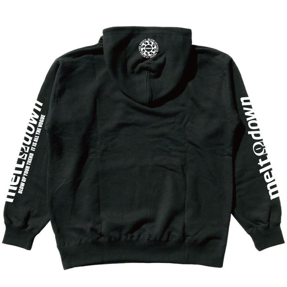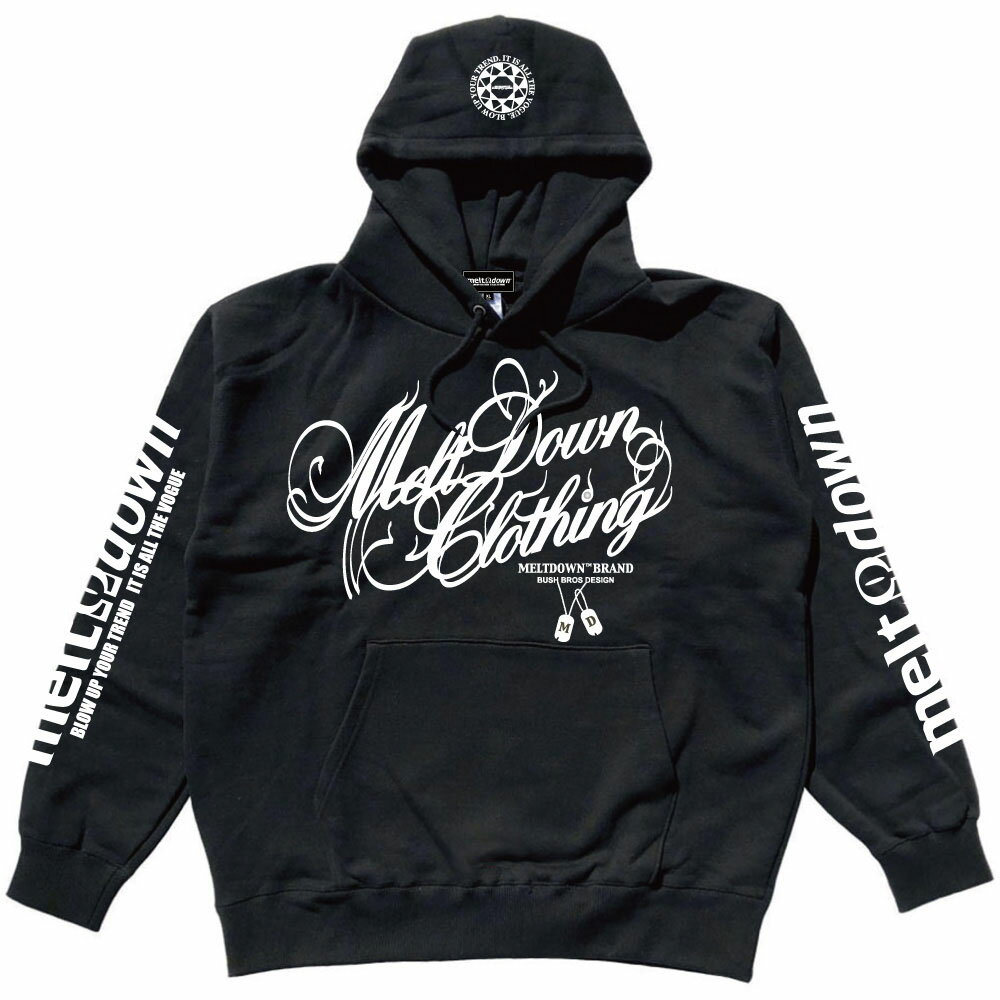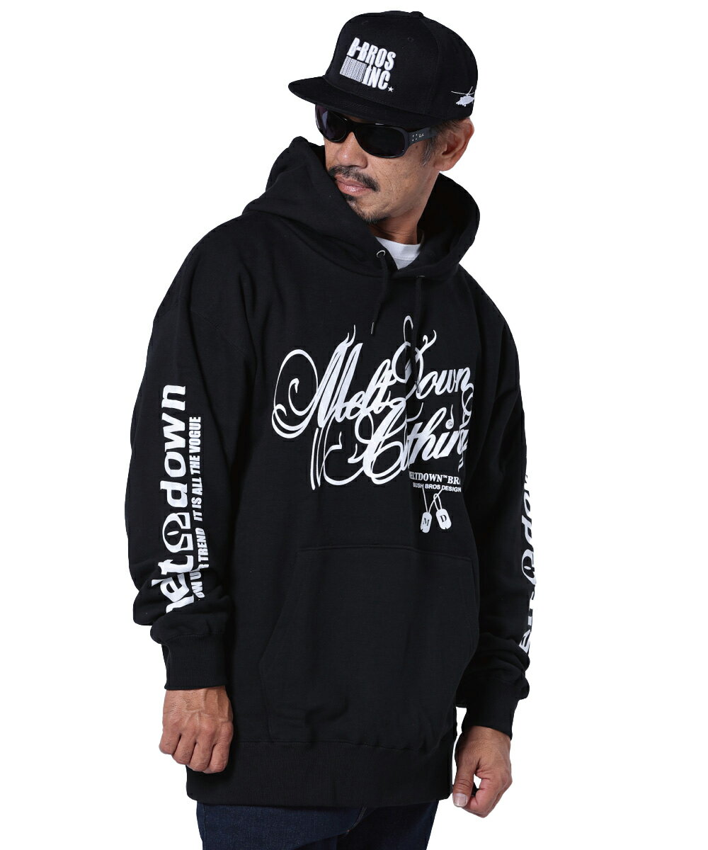 MELTDOWN(メルトダウン) スウェットパーカー SCRIPT HOOD SWEAT(MD-SWH01) メンズファッション ヒップホップ ダンス B系 レゲエ DJ ウェッサイ ローライダー 西海岸 車 ラッパー ストリート系 フード プルオーバー スクリプト ロゴ ラインストーン 袖プリント 大きいサイズ
