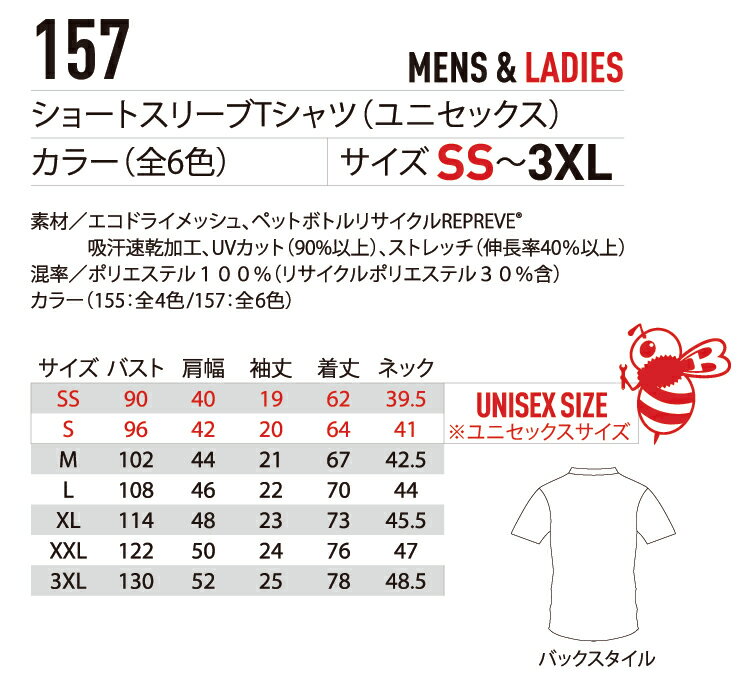 バートル【BURTLE】ショートスリーブTシャツ【 Dry Mesh series】 157 ペットボトルリサイクル素材 男女ユニセックスでチームウェアにも対応するシンプルなデザイン 男女兼用 【メール便送料無料】 【2022春夏新商品】