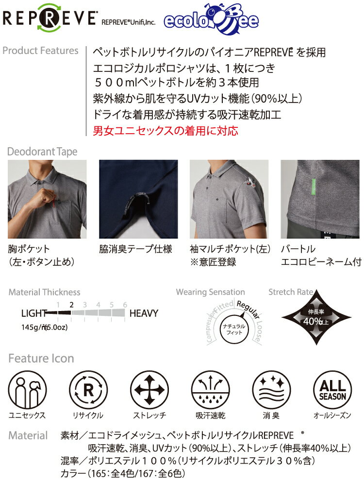 バートル【BURTLE】半袖ポロシャツ【 Dry Mesh series】 167 グローバルスタンダードであるSDGsを考慮して再生糸を用いたエコロジカルなポロシャツ 男女兼用 【メール便送料無料】 【2023春夏新商品】