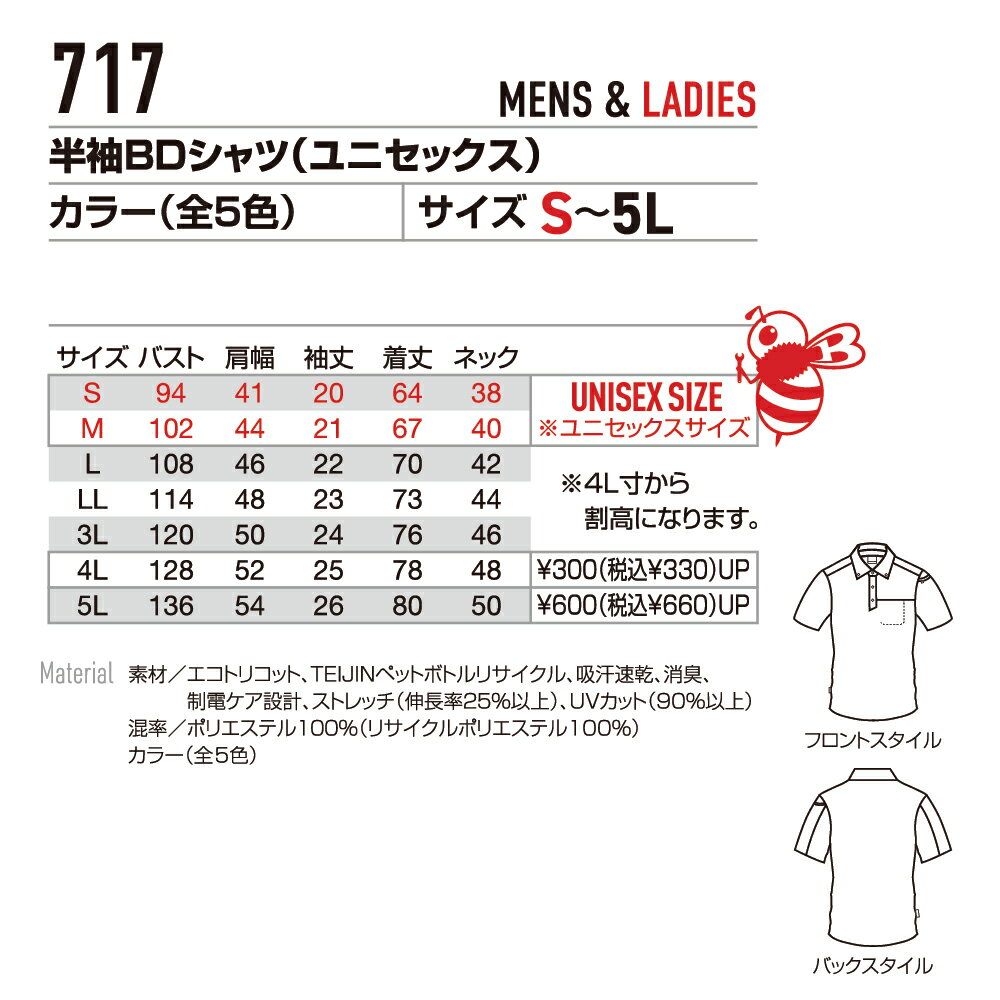 バートル【BURTLE】半袖BDシャツ 717 ワークから日常まで使いつくせるシンプルアイテム 半袖シャツ 男女ユニセックス 【2024春夏新商品】【メール便送料無料】