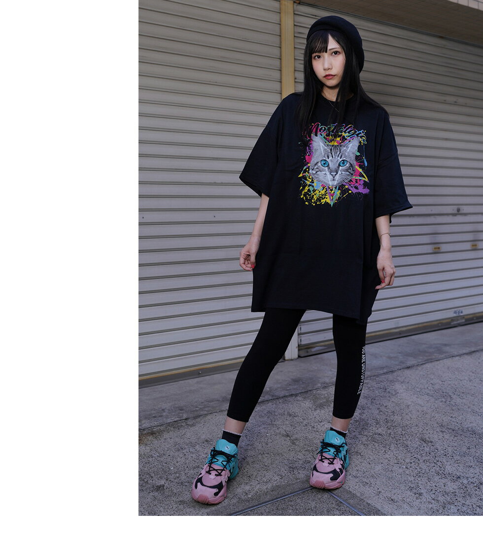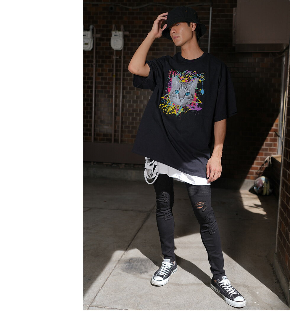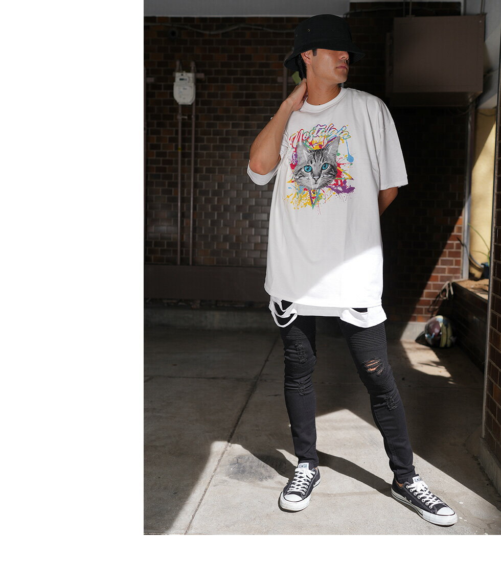 【マラソン期間★全品15%OFFクーポン】DIP CATビッグTシャツ(男女兼用)■トップス ロンT ロングtシャツ ろんt 長袖 五分袖 5分袖 tシャツ 長袖Tシャツ 猫 ネコ ねこ キャット cat ストリート 大きいサイズ ビックシルエット 病み メンズ レディース ユニセックス