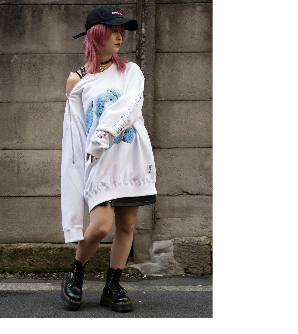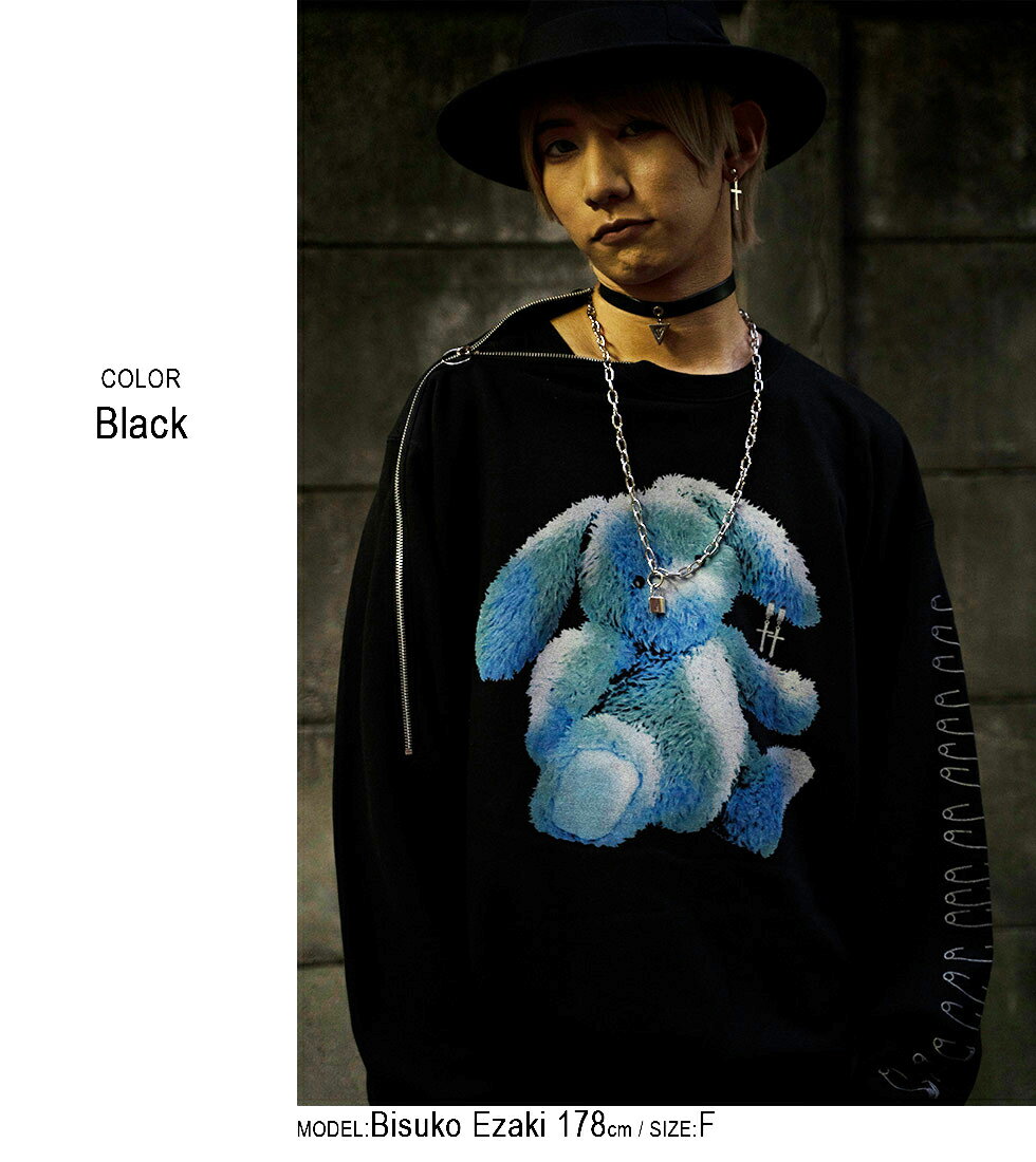 『東京裏側』SICKNESS Bunnyファスナー付きビッグトレーナー 男女兼用 トップス アウター 長袖 トレーナー 長袖トレーナー スウェット うさぎ ウサギ 兎 バニー ストリート 大きいサイズ やみかわ メンズ レディース ユニセックス 病みかわ 病みかわいい 病み系 病み 闇 服