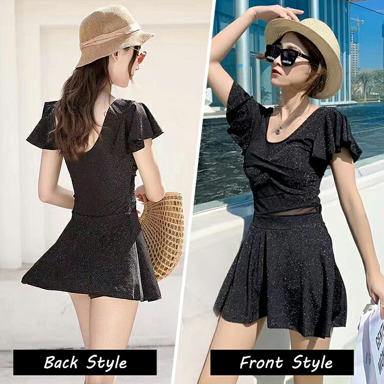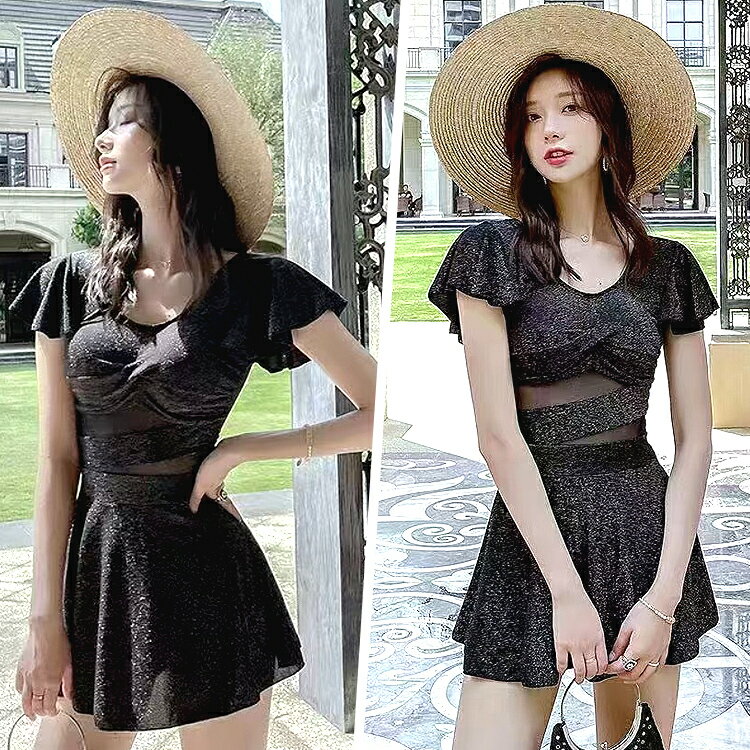 水着 レディース 体型カバー ワンピース 可愛い 女の子 女性 大人 体型 おしゃれ オールインワン フリル フレアスカート 無地 シンプル エレガント 10代 20代 30代 40代 中学生 高校生 大学生 ブラック 黒 肩出し M L
