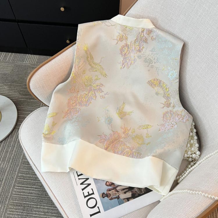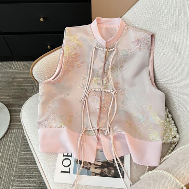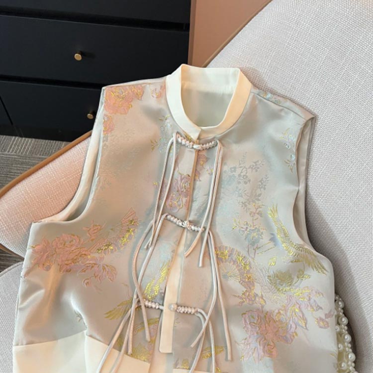 ジレ ベスト レディース 春 夏 秋 冬 チャイナ ベスト チャイナベスト チャイナジレ 唐装 前開き チャイナボタン スタンドカラー トップス ノースリーブ ミドル丈 中華風 刺繍 柄 タッセル ジャカード サマージャケット 羽織り 重ね着 レイヤード 上品 フェミニン 大人可愛い