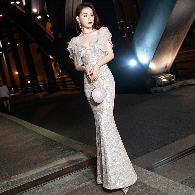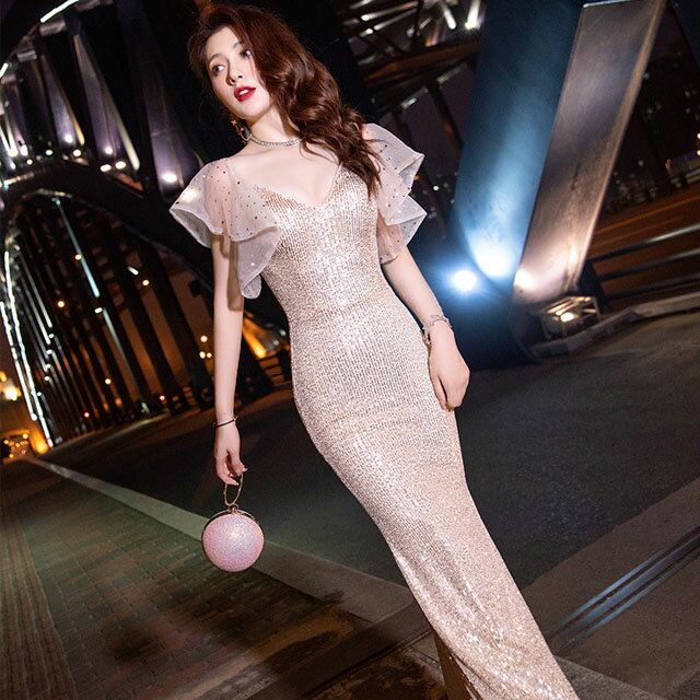 スパンコールドレス キラキラドレス シャンパン色 イブニングドレス マーメイドドレス Vネック セクシー タイトドレス ロング フレア袖 ロングドレス 袖あり パーティードレス 二次会ドレス お呼ばれ 発表会ドレス 送料無料
