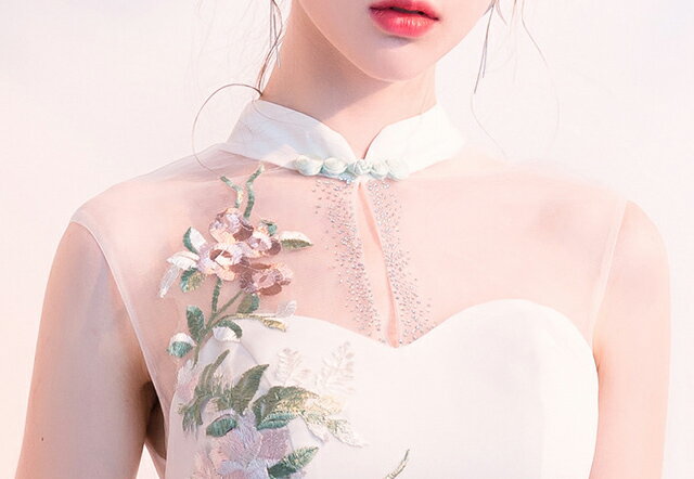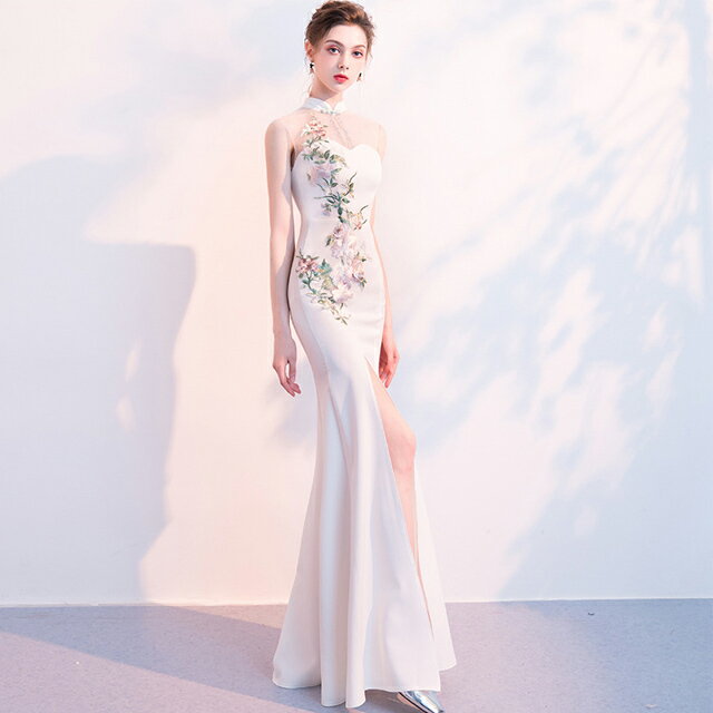 マーメイドドレス スリット チャイナドレス 刺繍 キレイめ ロングドレス マーメイドライン ノースリーブ イブニングドレス サテン ドレス 白 ホワイトドレス ロング丈 パーティードレス 30代 送料無料