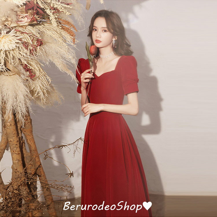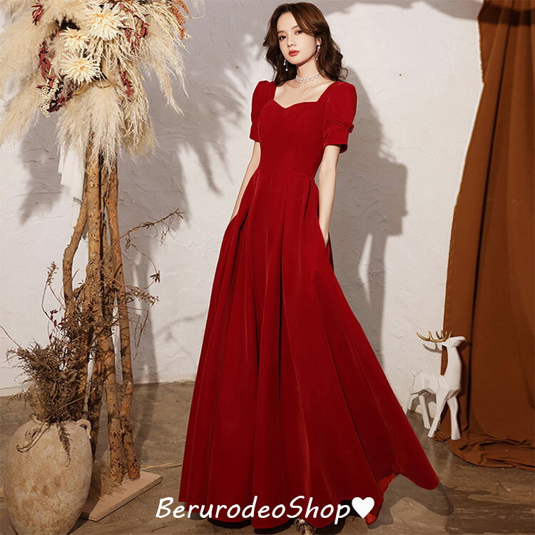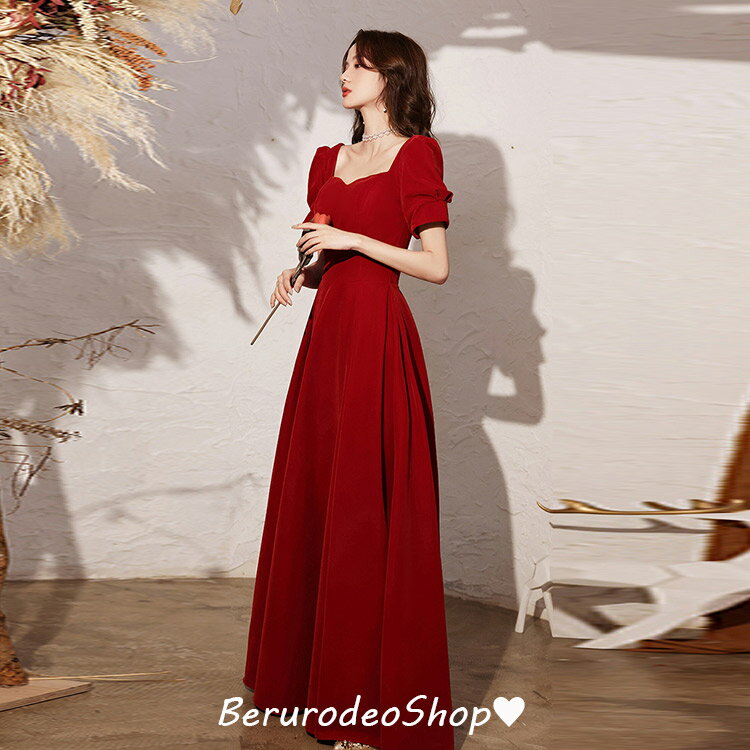 イブニングドレス ワイン赤 結婚式ドレス 二次会ドレス ロングドレス ワインレッド ゲストドレス パフスリーブ Vネック 発表会ドレス Aライン ロング丈 パーティードレス お呼ばれドレス 20代 30代 40代 送料無料