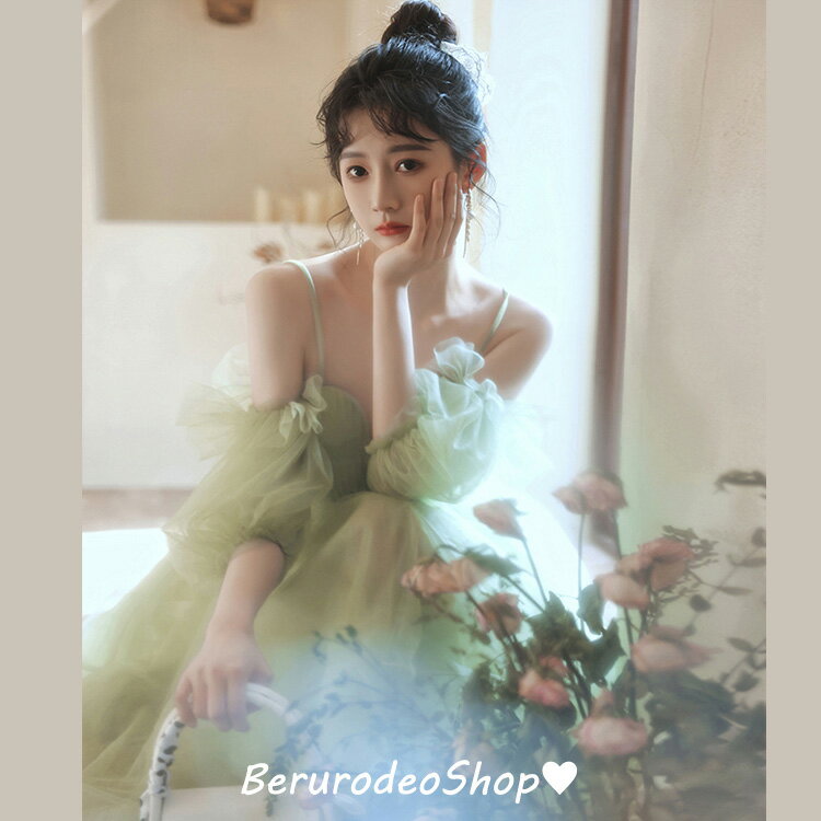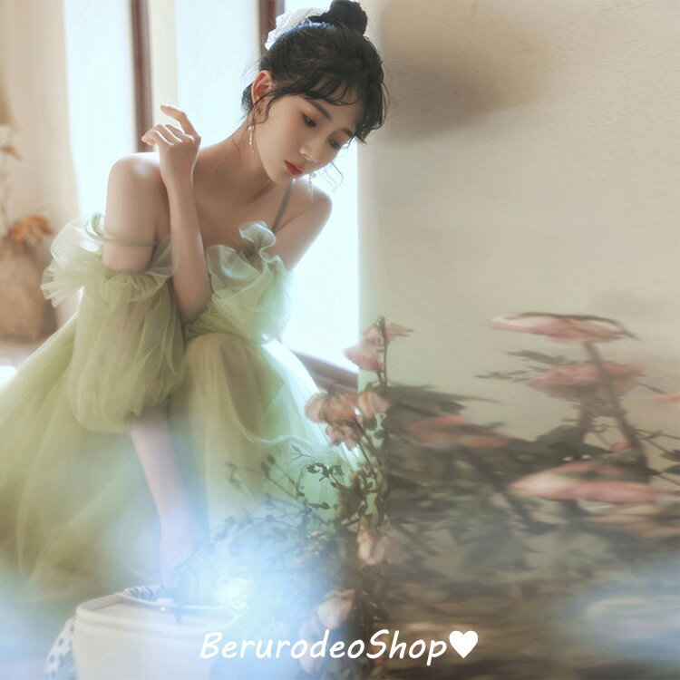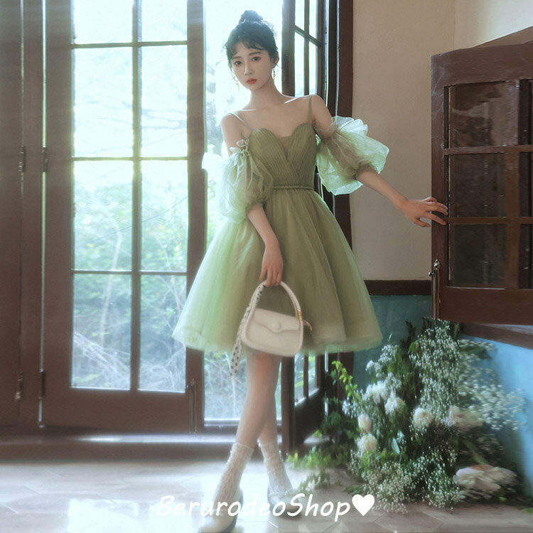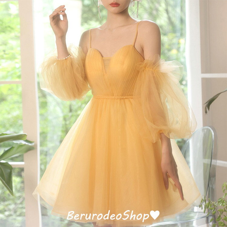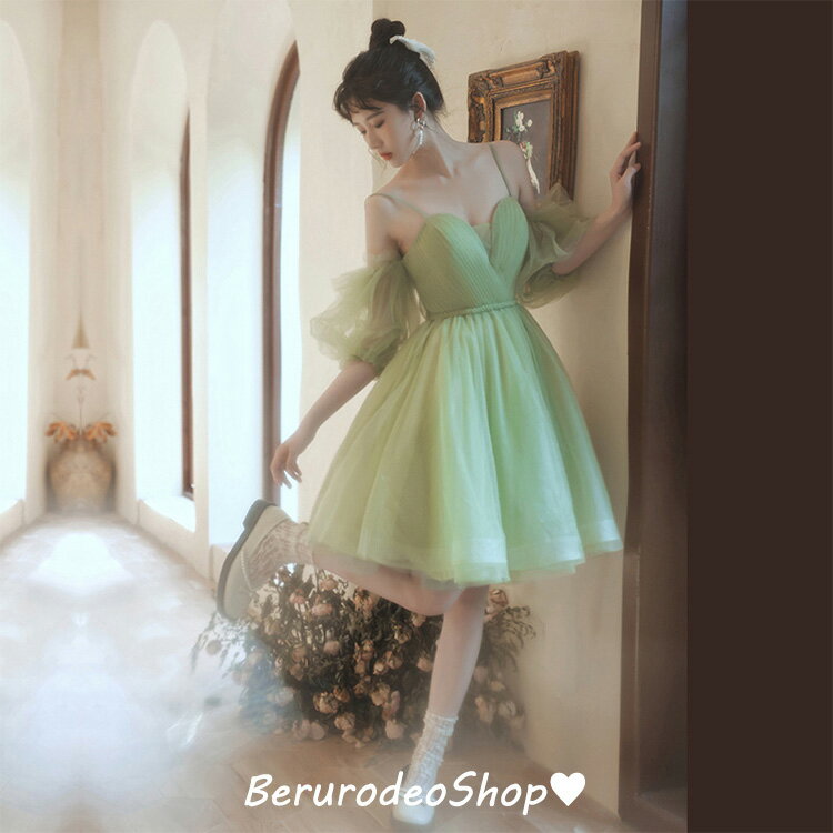 結婚式ドレス 二次会ドレス グリーン ショート丈 ドレス 可愛い 20代 30代 チュール キャミドレス オフショルダー パフスリーブ ミニドレス パーティードレス イエロー 白 ホワイト 送料無料
