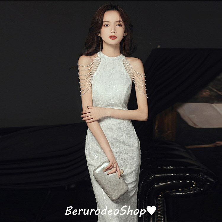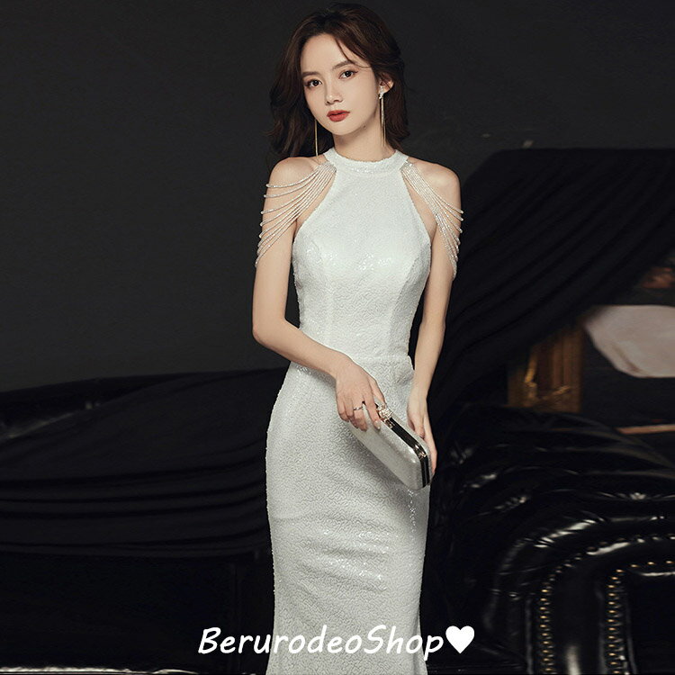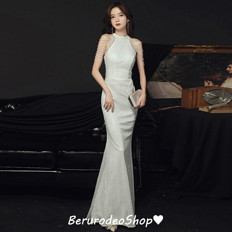 イブニングドレス マーメイドドレス ホルターネック フリンジ ビーズ キレイめ ロングドレス 発表会ドレス マーメイドライン ノースリーブ パーティードレス 白 ホワイト 送料無料