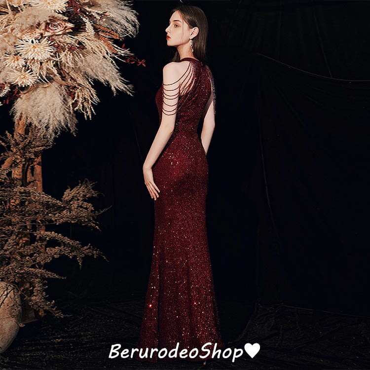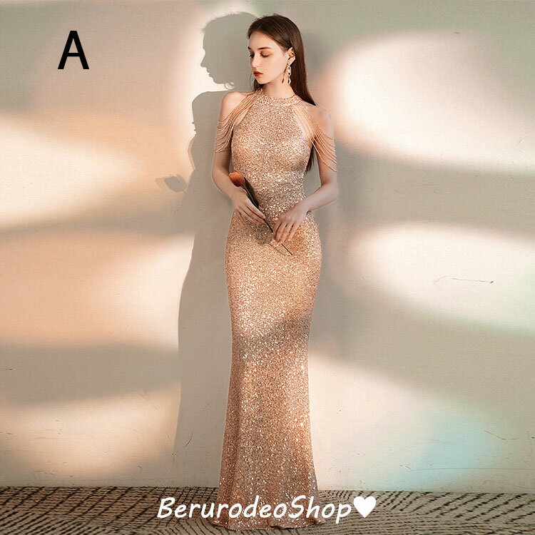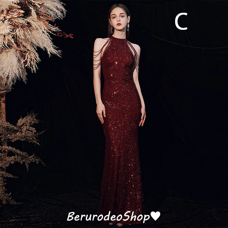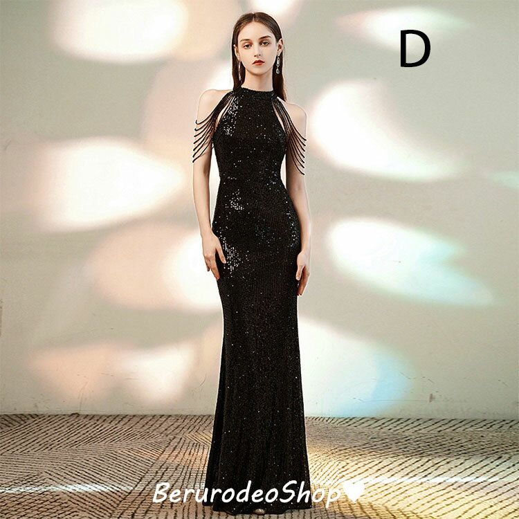 イブニングドレス マーメイドドレス ホルターネック フリンジ ビーズ キレイめ キラキラドレス スパンコール ドレス シルバー ゴールド 黒 ワイン赤 ロングドレス 発表会ドレス ナイトドレス セクシー 送料無料