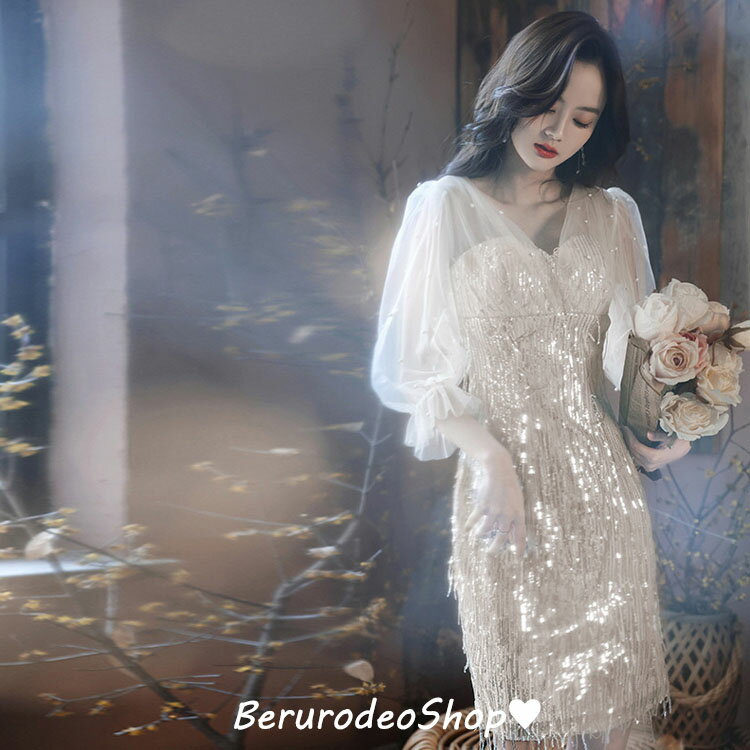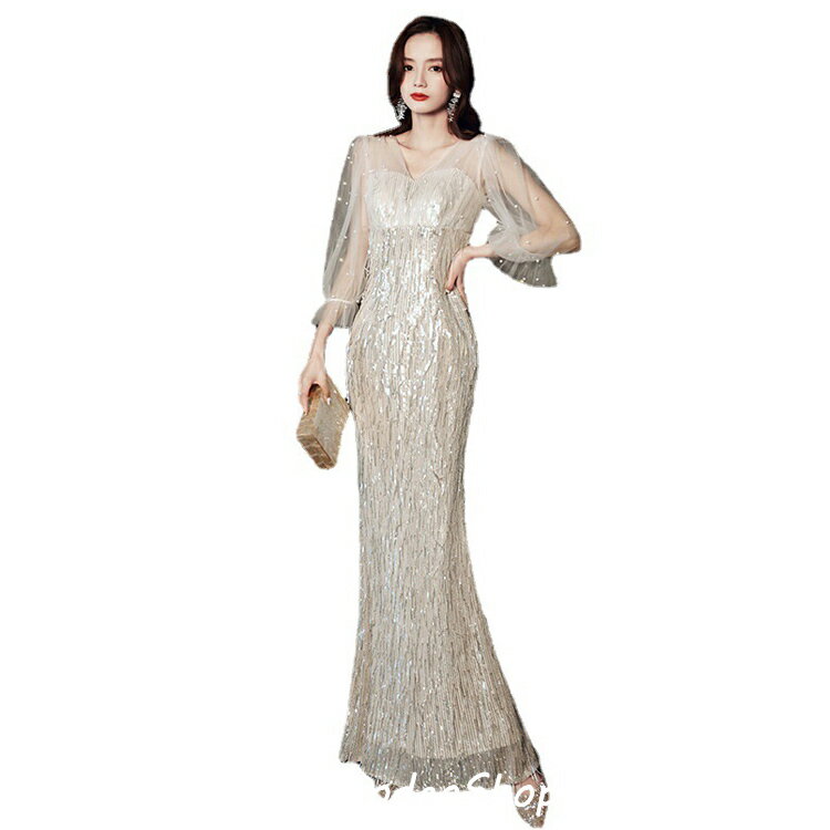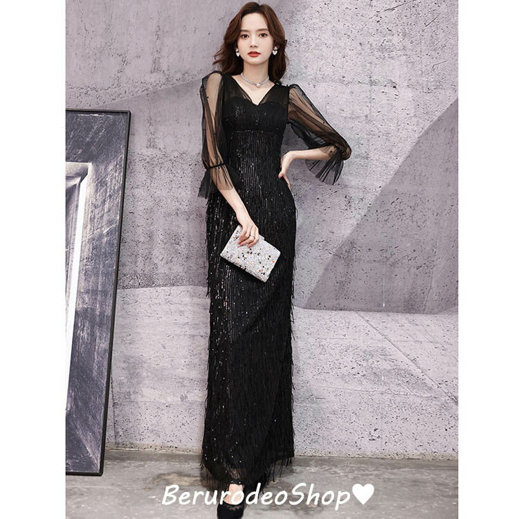 送料無料 イブニングドレス マーメイドドレス キラキラドレス スパンコール 発表会ドレス 黒 シャンパン色 Vネック エレガント ロングドレス 結婚式ドレス 二次会ドレス ブラック 7分袖 パーティードレス S M L XL XXL XXXL