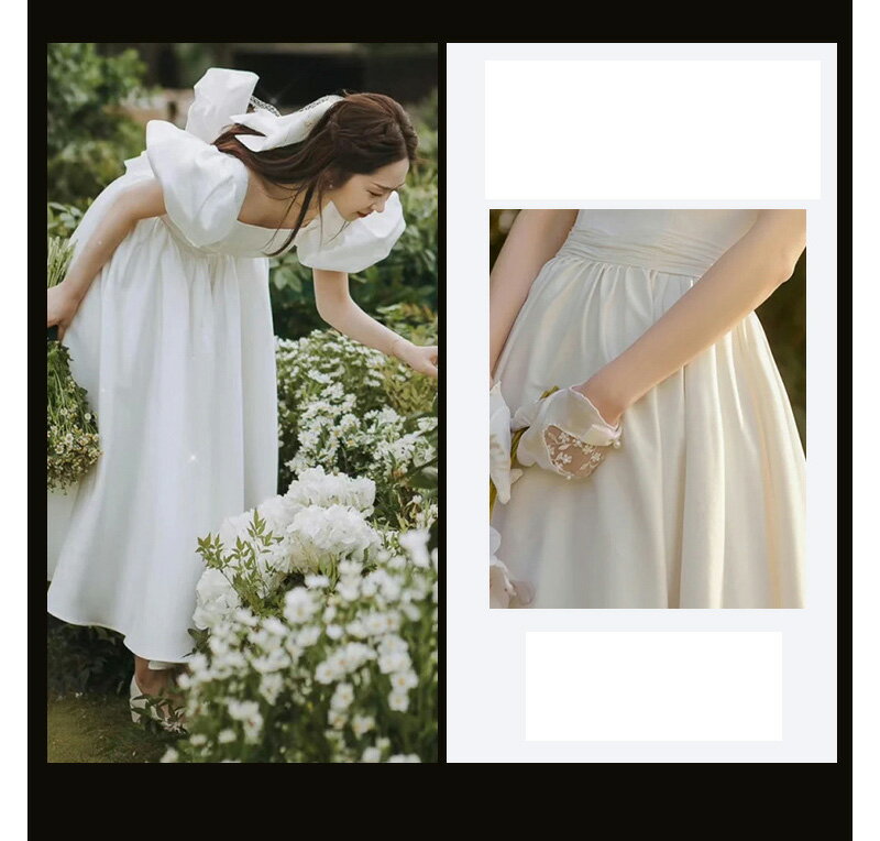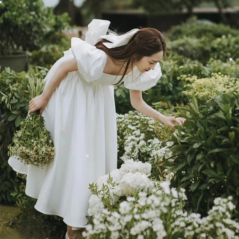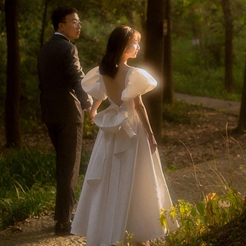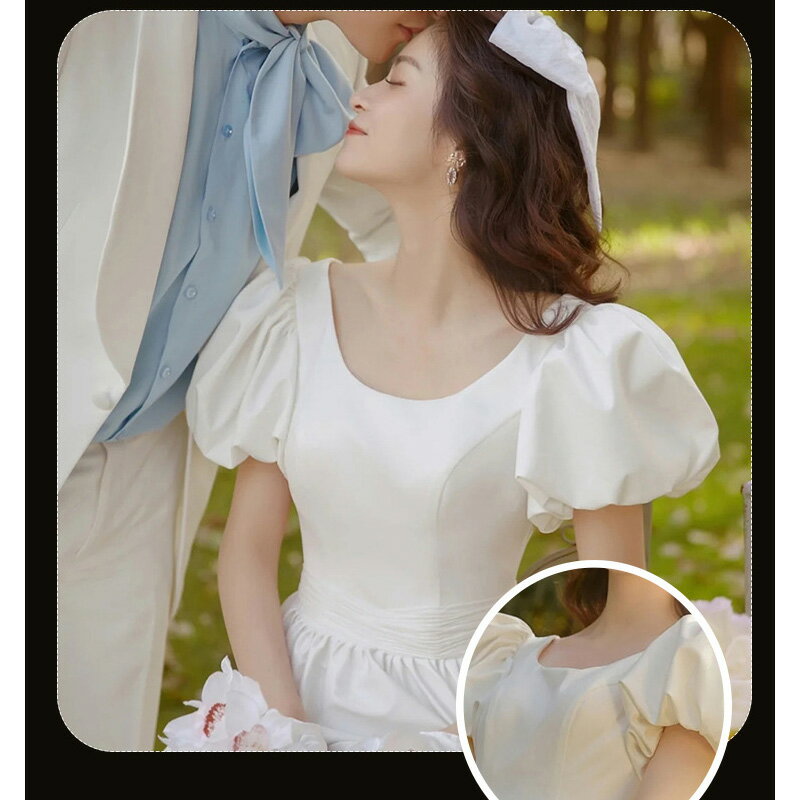 送料無料 二次会ドレス 白 サテンドレス ウェディングドレス パフスリーブ Aライン 可愛い エレガント ロングドレス 結婚式ドレス 二次会 背開き セクシー ホワイトドレス ウェディング 海外挙式 撮影 無地 XS S M L XL