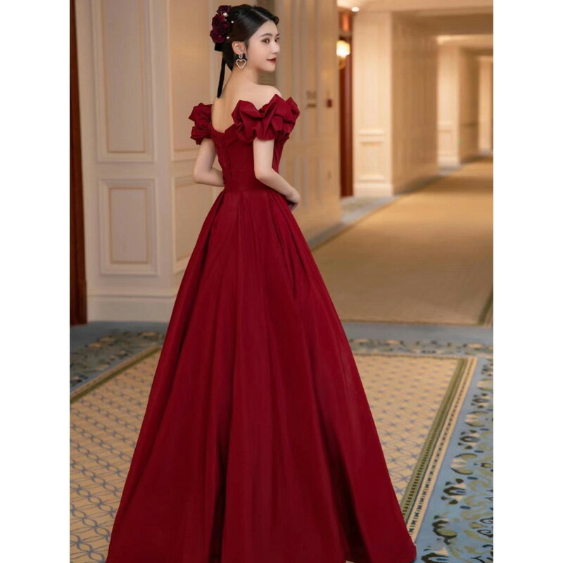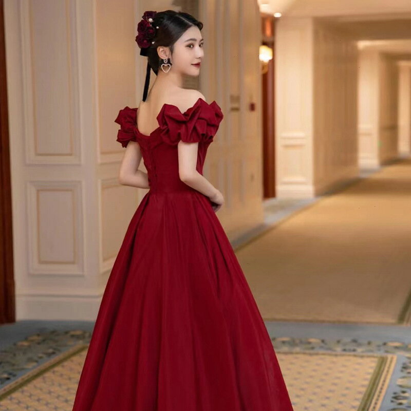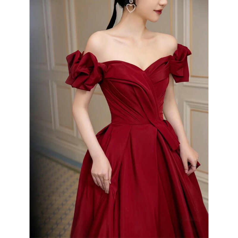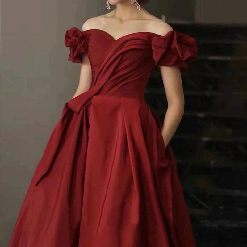 送料無料 結婚式ドレス 二次会ドレス ワイン赤 オフショルダー サテンドレス ゲストドレス ロング ワインレッド 結婚式 二次会 パーティードレス ロングドレス イブニングドレス 発表会ドレス 無地 可愛い オフショル Vネック セクシー XS S M L XL XXL XXXL