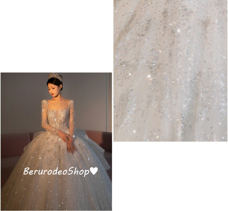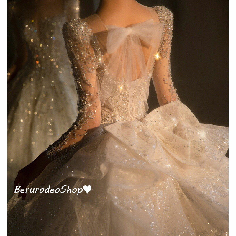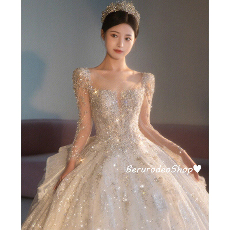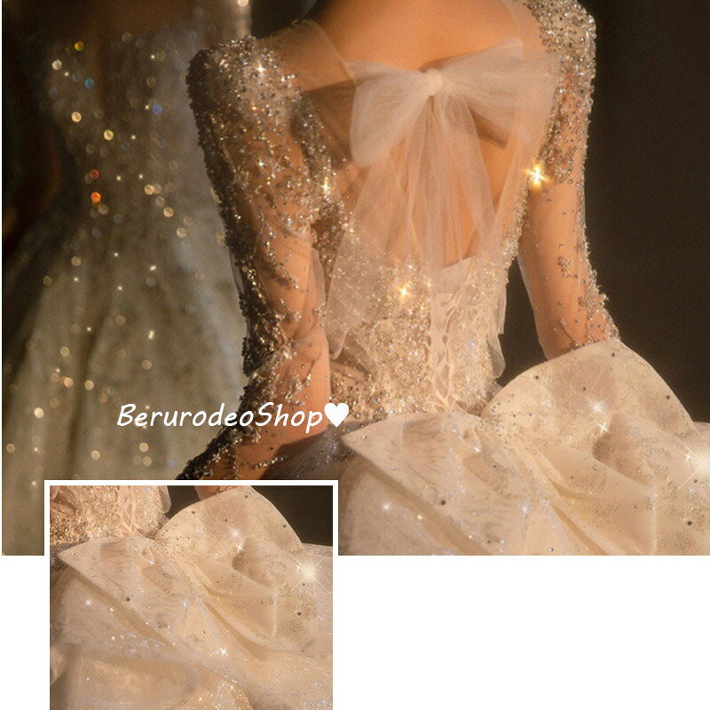 送料無料 ウェディングドレス 白 長袖 スパンコール キラキラドレス 素敵 キレイめ 結婚式ドレス 二次会ドレス 袖あり 花嫁ドレス ロングドレス Aライン バックリボン プリンセスドレス ブライダルドレス トレーンドレス S M L XL XXL