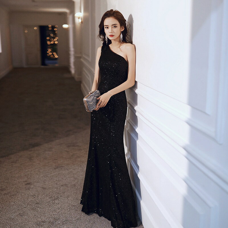 送料無料 マーメイドドレス イブニングドレス 黒 ワンショルダー キラキラドレス スパンコール ロングドレス 発表会ドレス ブラック パーティードレス オシャレ キレイめ ドレス マーメイドライン S M L XL XXL XXXL