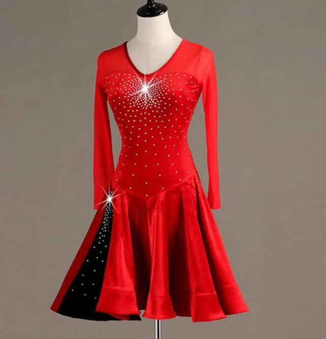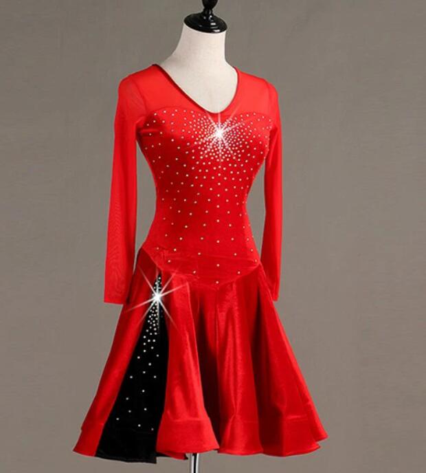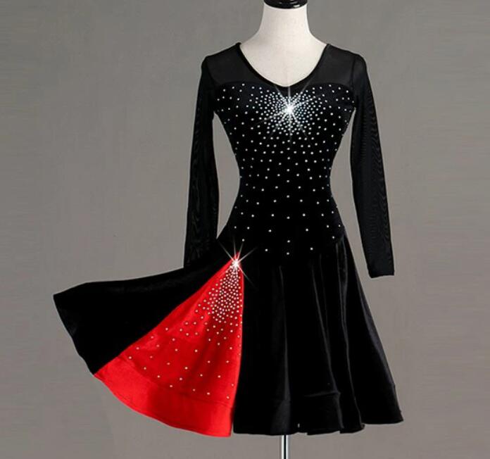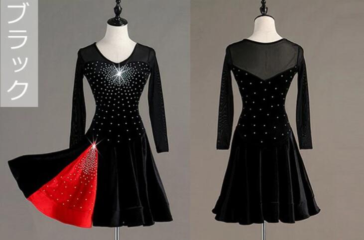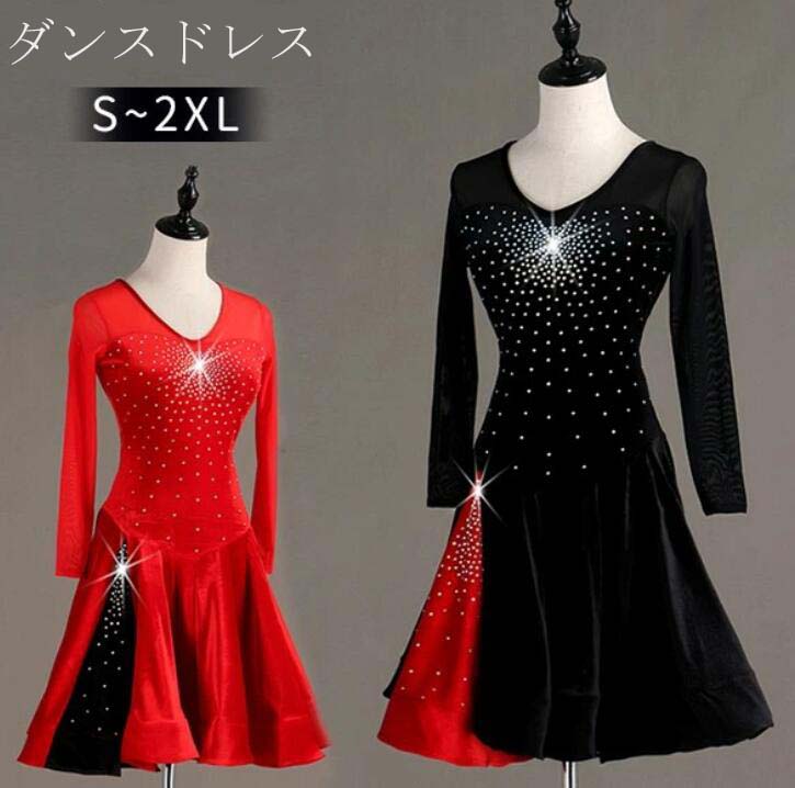 送料無料 社交ダンス パット付き ラテンドレス スタンダード 競技用ドレス 長袖 ワンピース ステージ衣装 ラテン専用ドレス レッスン着 スパンコール 発表会用 社交ダンス演出服 ルンバ サンバ ワルツ フリル裾 ブラック レッド