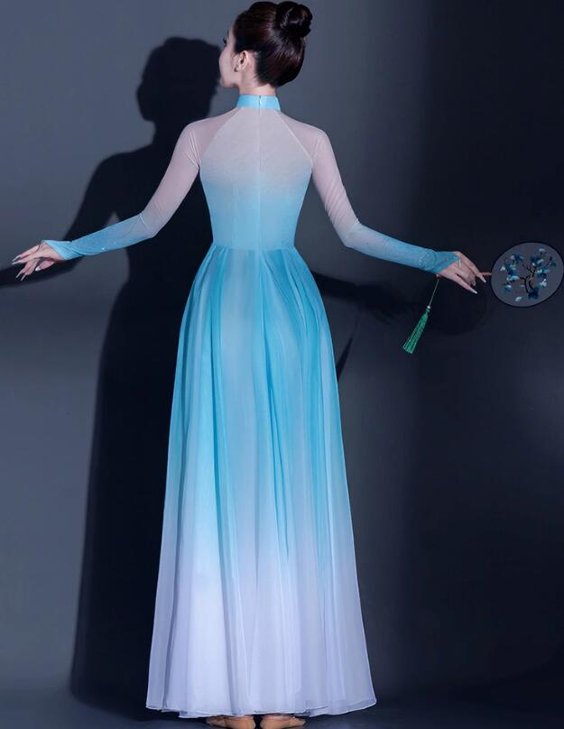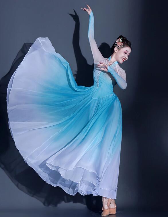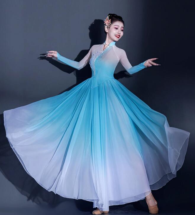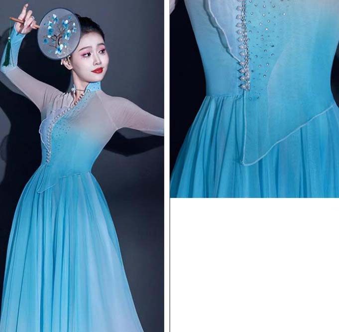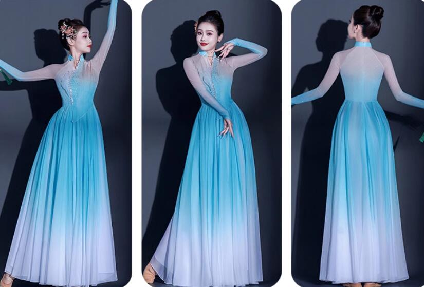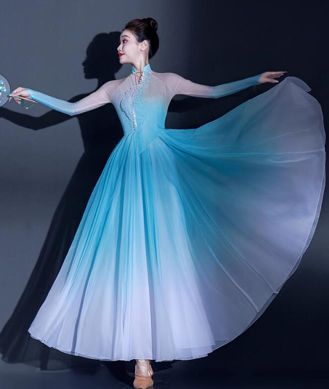送料無料 社交ダンス 衣装 花柄 中指にかける モダンドレス 社交ダンス 古典服 社交ダンス 練習着 演出服 舞台演出ロングドレス 合唱団 演奏会 社交ダンス衣装 ブルー 大きいサイズ S M L XL 2XL 3XL