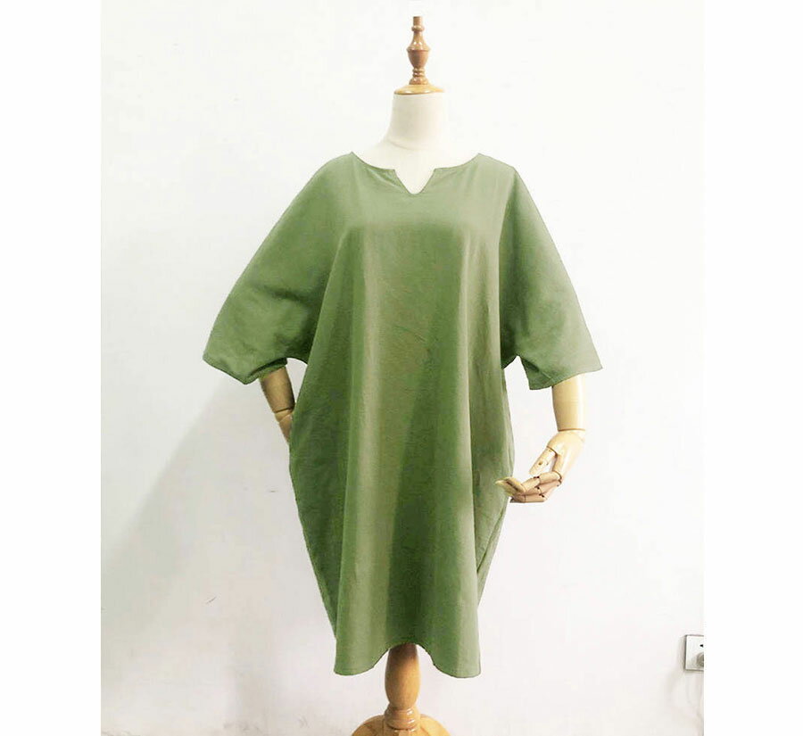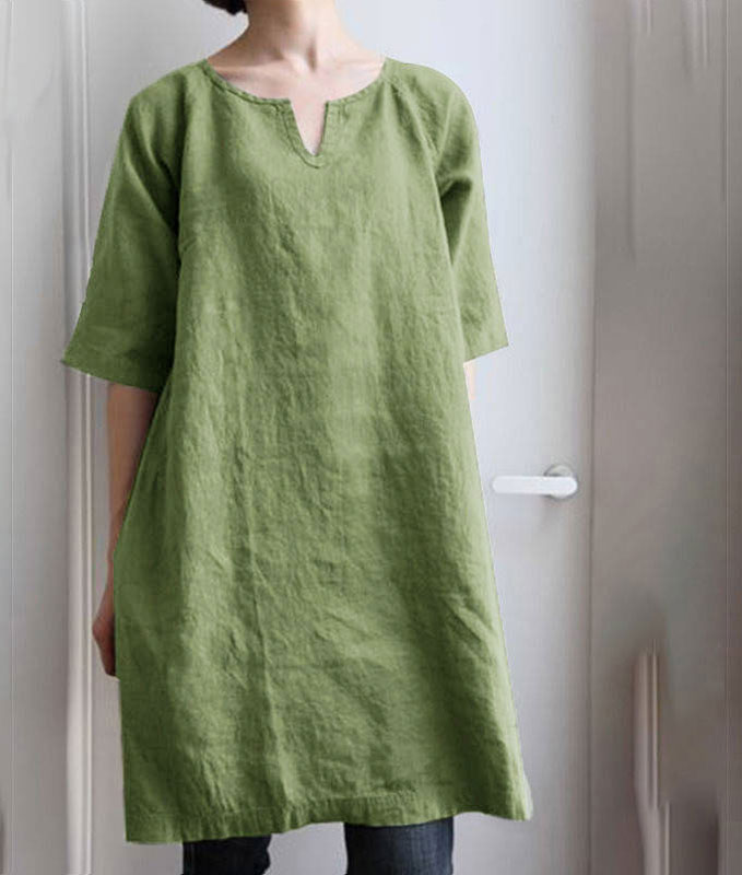 トップス チュニック ワンピース ロングシャツ vネック 無地 5分袖 レディース ロング 綿麻混 リネン ポケット付き ドルマン袖 大きいサイズ 体型カバー 夏