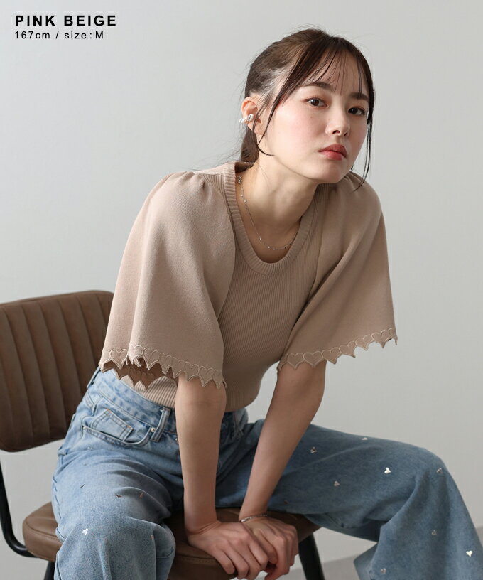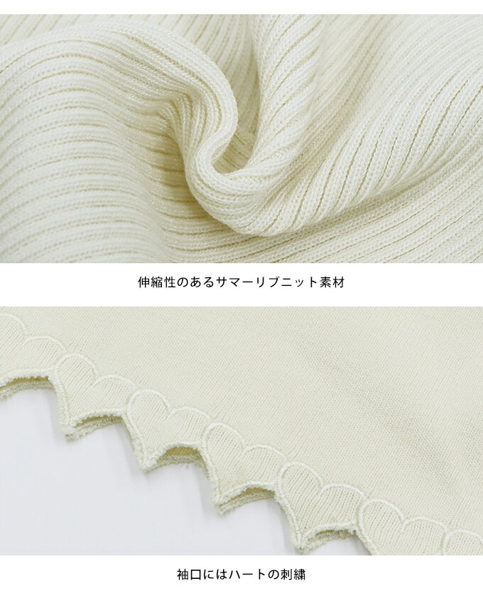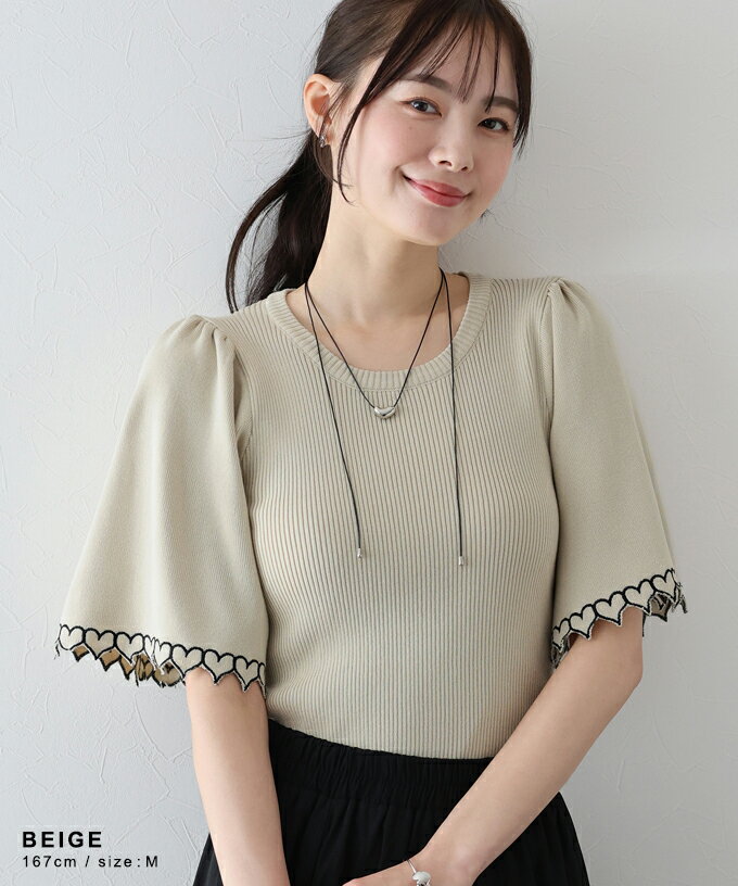 【送料無料】ハートカットワークフレアー袖ニット ハート刺繍 レディース フレアー袖 五分袖 トップス プルオーバー クルーネック リブニット 無地 春 夏 秋 カジュアル きれいめ シンプル おしゃれ トレンド 二の腕カバー オフィス 通勤 着回し BLUEEAST