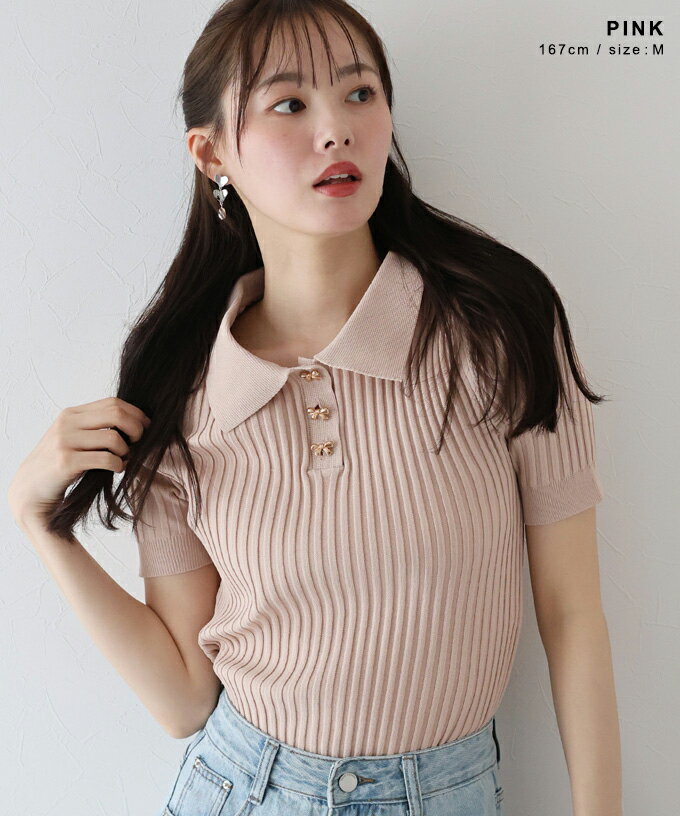【送料無料】リボンボタンポロ衿ニット ポロニット レディース リブニット 半袖 トップス 春 夏 サマーニット プルオーバー 襟付き 無地 シンプル カジュアル オフィス 通勤 かわいい おしゃれ トレンド 着回し