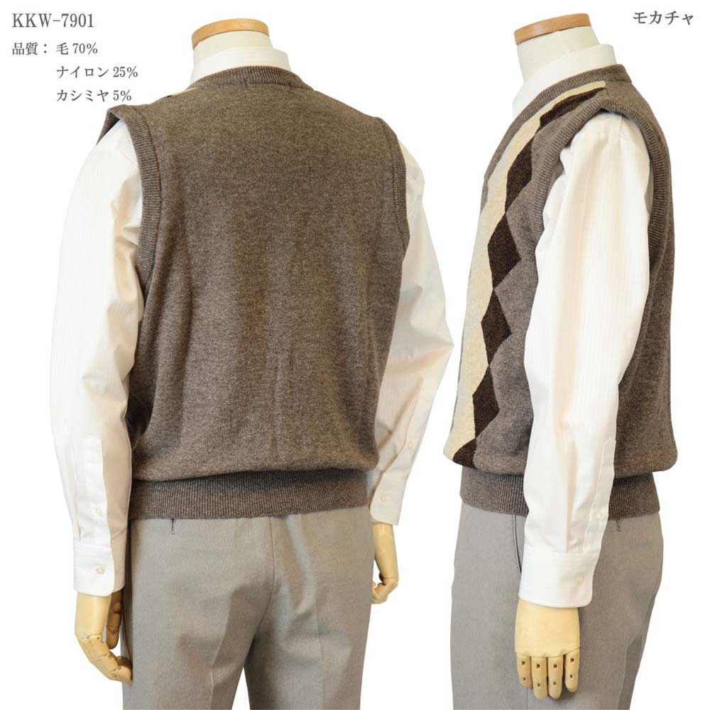 ◆SALEさらにクーポンで20%OFF◆ ベスト V首(クルーネック) カシミヤ入りウール混 日本製 ダイヤ柄 10ゲージ 紳士/メンズ/シニア/国産【送料無料】 (7901)