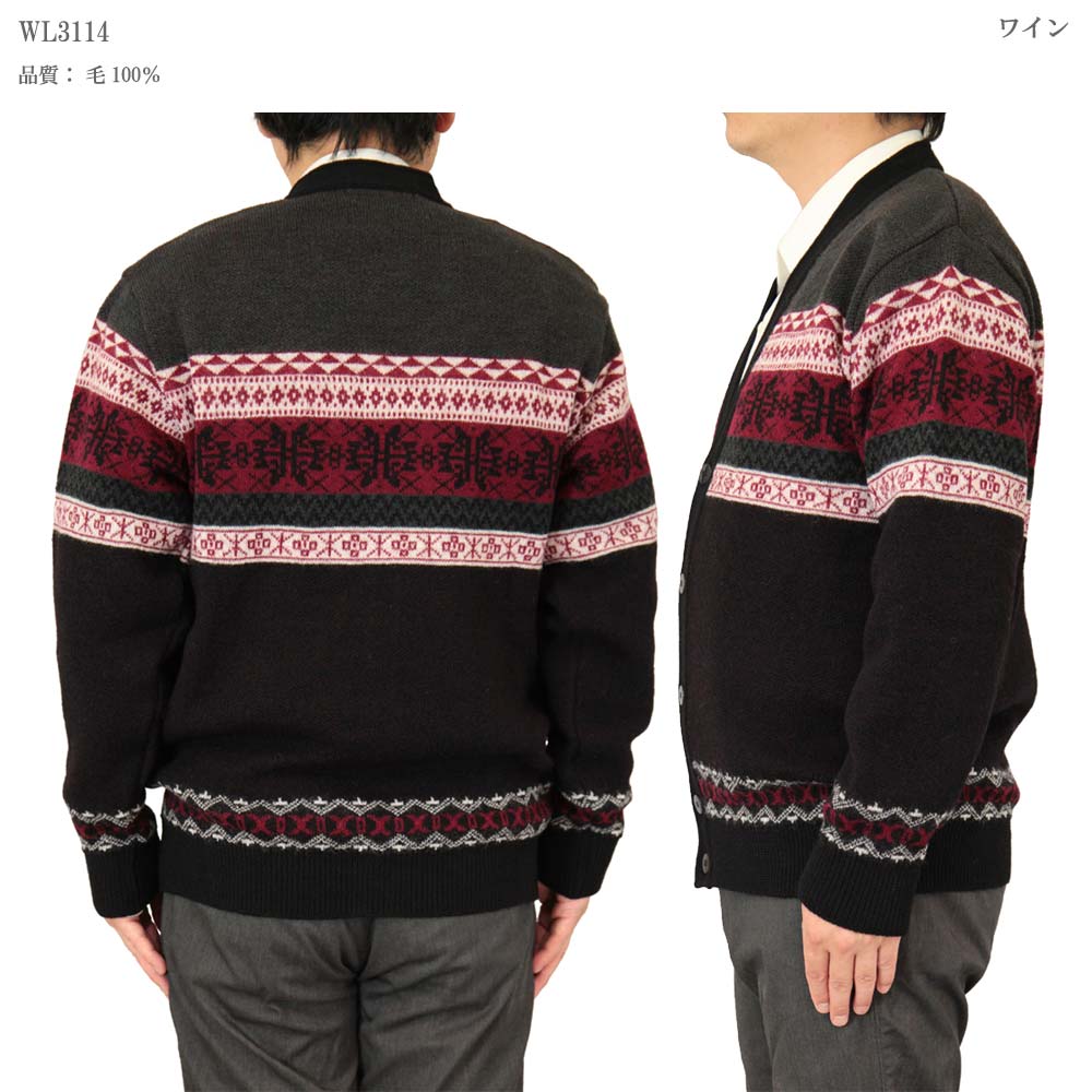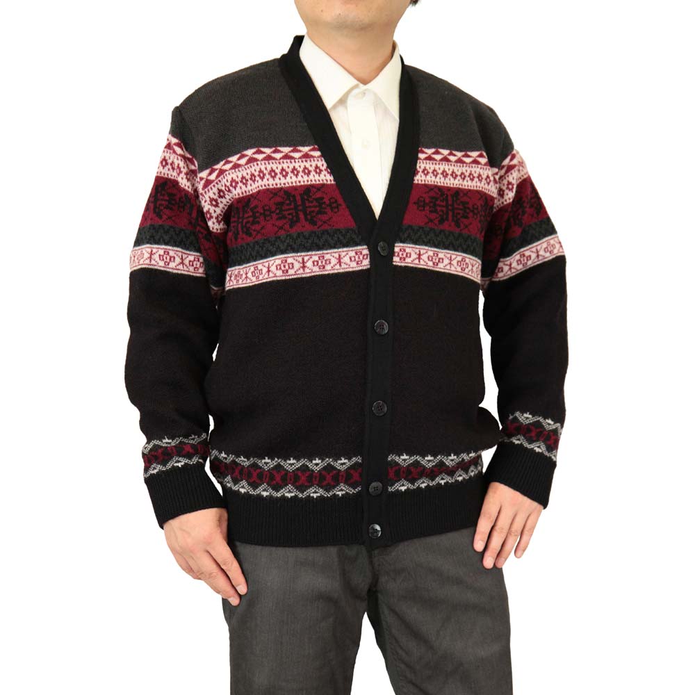 ◆クーポンで20%OFF◆ カーディガン V首 ウール100% 日本製 ジャカード編みフェアアイル柄ニット 7ゲージ 紳士/メンズ/シニア/国産【送料無料】 (3114)