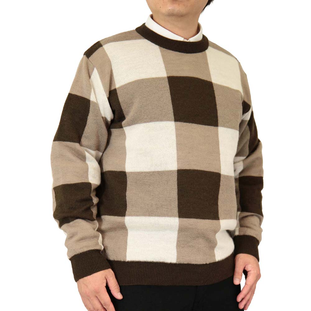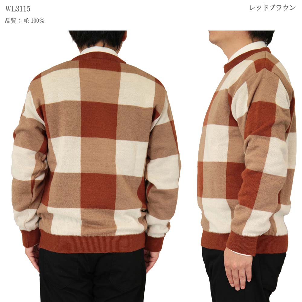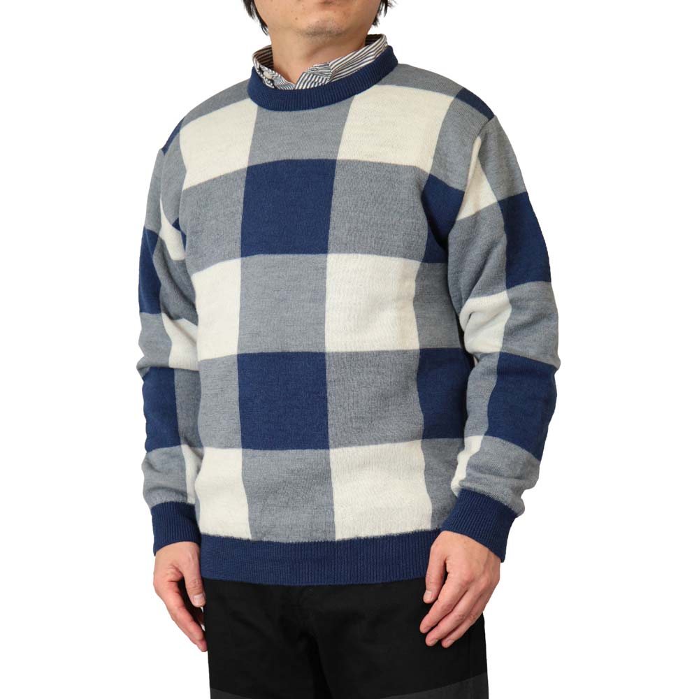 ◆SALEさらにクーポンで20%OFF◆ セーター 丸首(クルーネック) ウール100% 日本製 ジャカード編みブロック柄ニット 10ゲージ 紳士/メンズ/シニア/国産【送料無料】 (3115)
