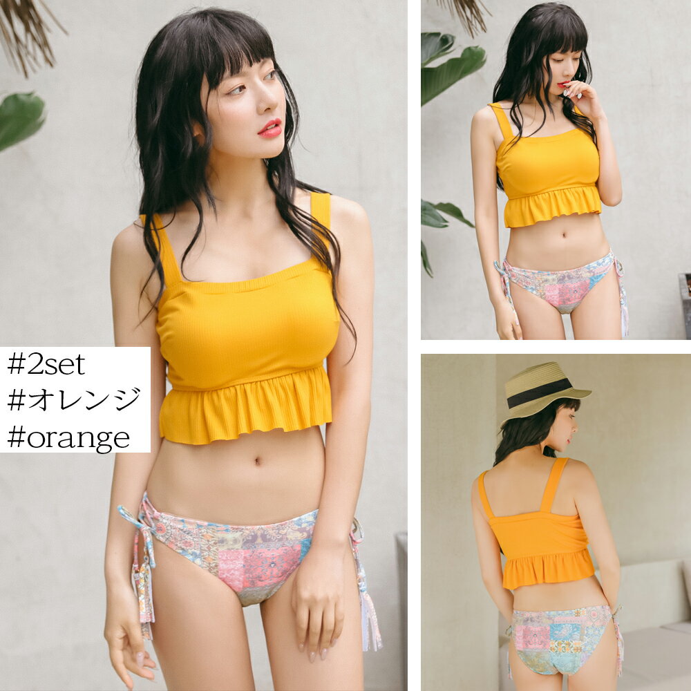 ビキニ 水着 レディース 体型カバー エスニック柄 フレア ビスチェ プール 海 ビーチ セクシー 露出控えめ ハイウエスト リブ ニット フリル レースアップ オトナ女子 かわいい ワイヤー入り ママ水着 10代 20代 30代 40代 白 レッド イエロー 無地 韓国 中高生 2021新作