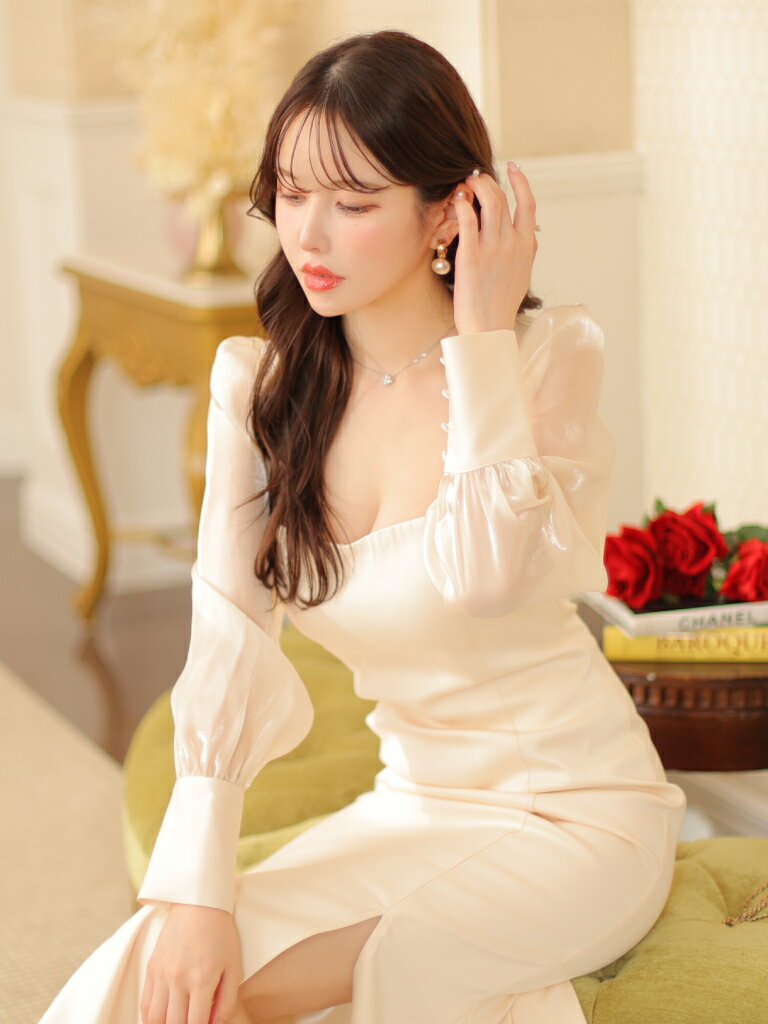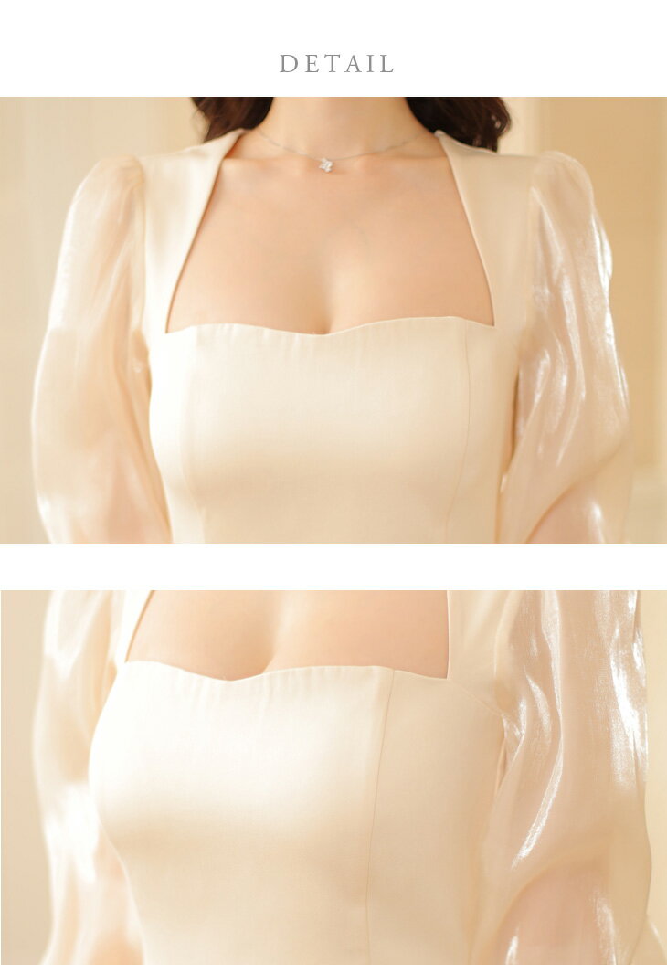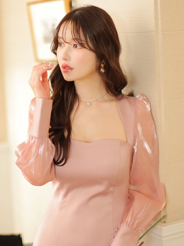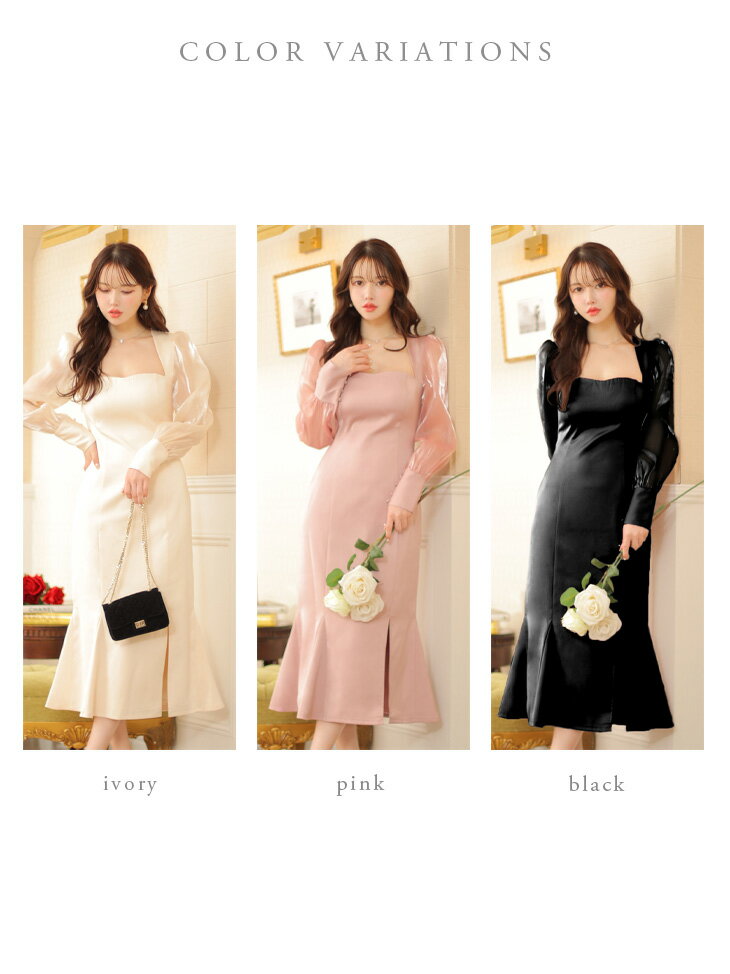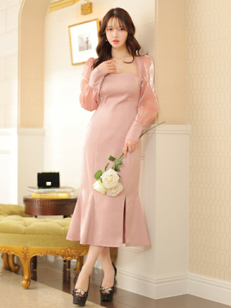 【DEA. by ROBE de FLEURS/ディアバイローブドフルール】サテン/ オーガンジー/ 長袖/ スクエアネック/ マーメイド/ ミディドレス/ ロングドレス/ キャバドレス/ ワンピース [DE3247] ミディアムドレス ミモレ 膝下 ロング丈 ナイトドレス シンプル 袖あり