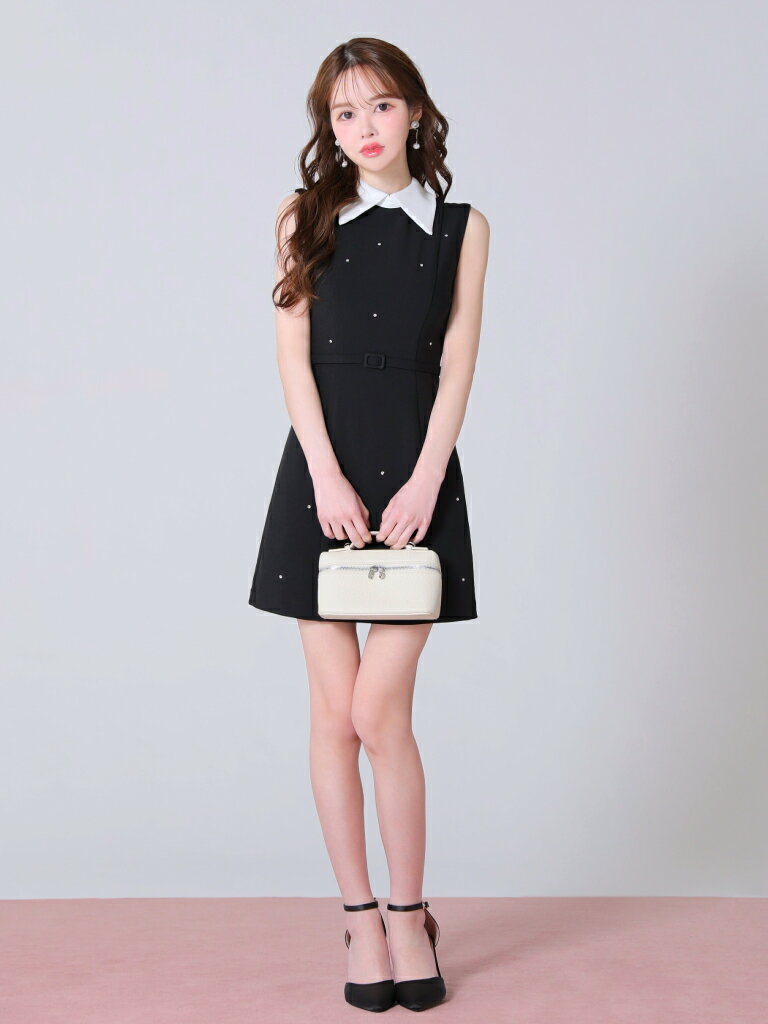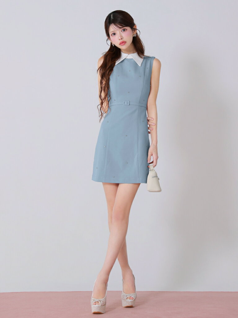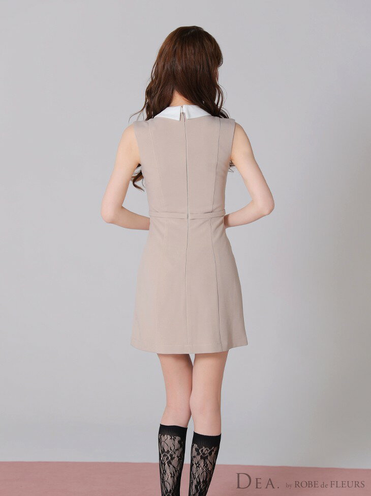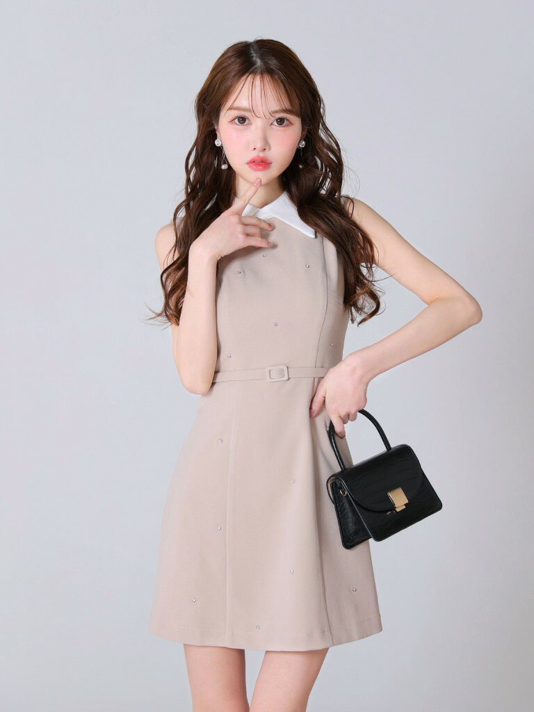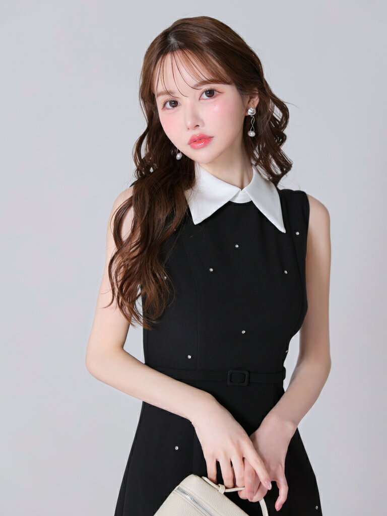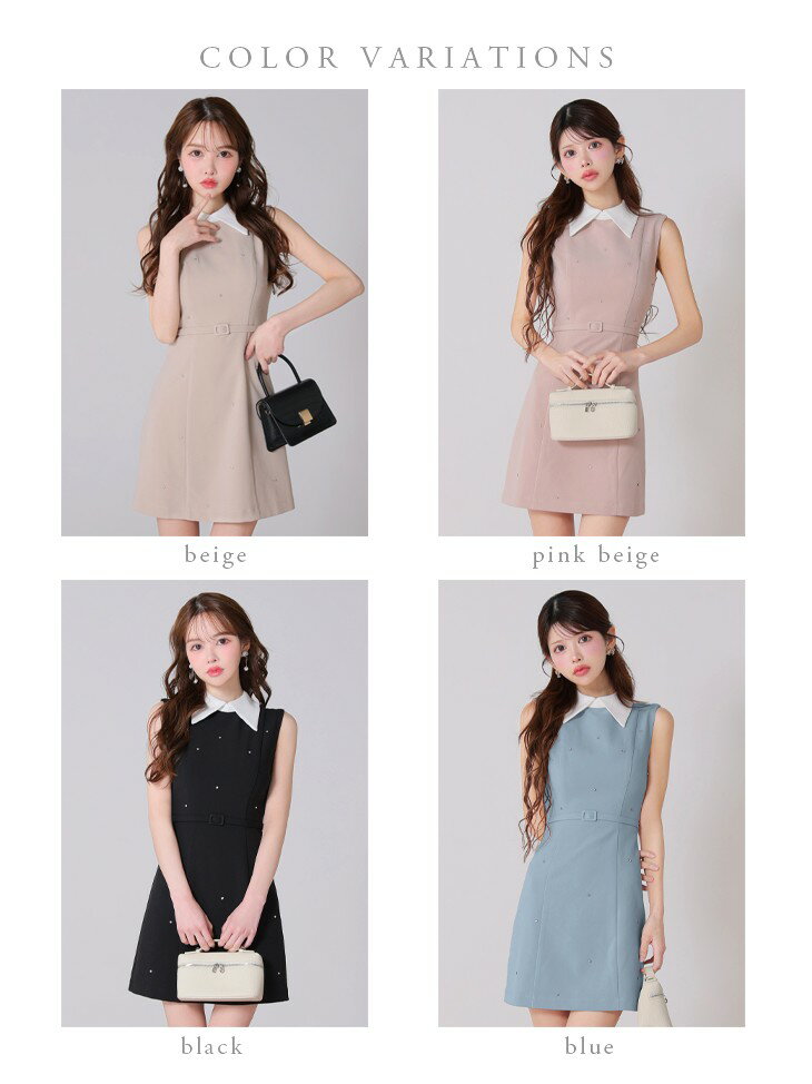 【DEA. by ROBE de FLEURS/ディアバイローブドフルール】ストレッチ/ ビジュー/ 襟付き/ ノースリーブ/ 台形/ フレア/ ベルト/ ミニドレス/ キャバドレス/ ワンピース [DE3384] S/M/L 送料無料 シンプル Aライン 上品 膝丈 ショート パーティードレス ブラ着用可 韓国 私服