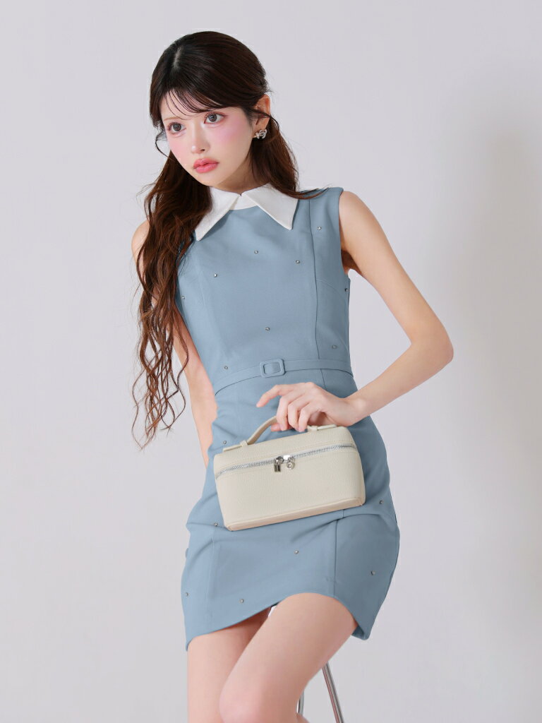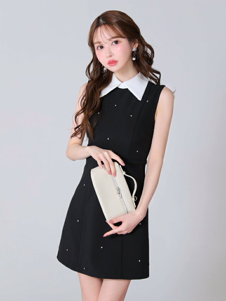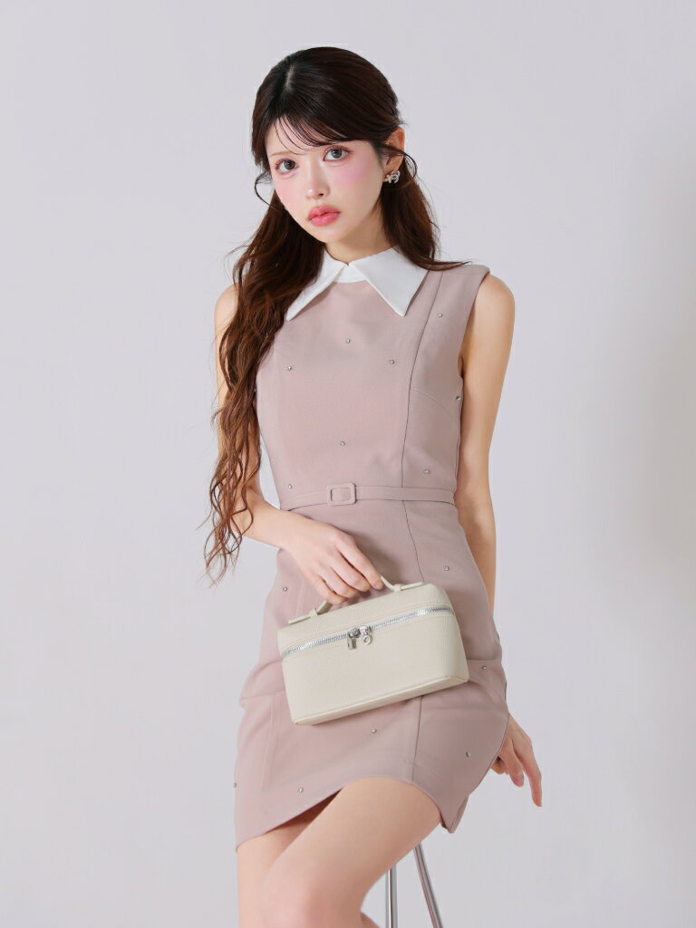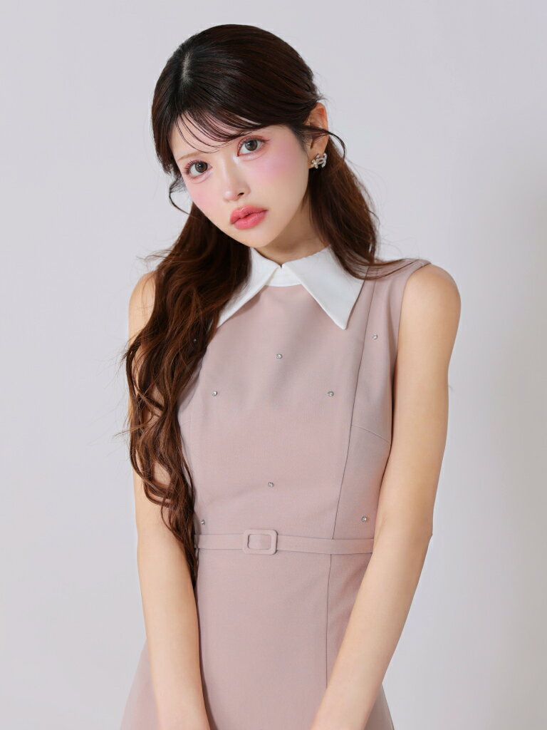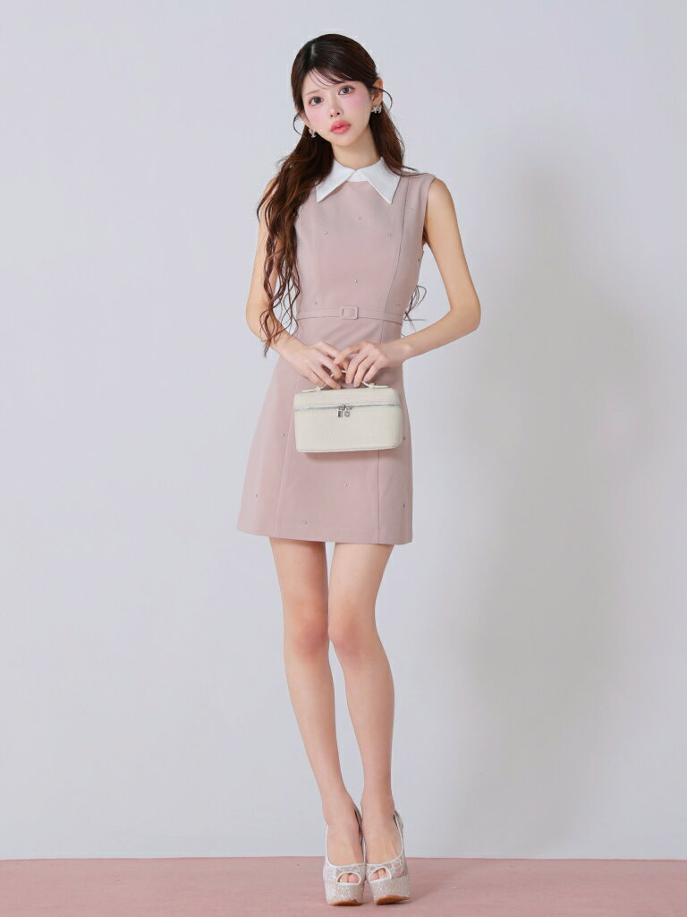 【DEA. by ROBE de FLEURS/ディアバイローブドフルール】ストレッチ/ ビジュー/ 襟付き/ ノースリーブ/ 台形/ フレア/ ベルト/ ミニドレス/ キャバドレス/ ワンピース [DE3384] S/M/L 送料無料 シンプル Aライン 上品 膝丈 ショート パーティードレス ブラ着用可 韓国 私服