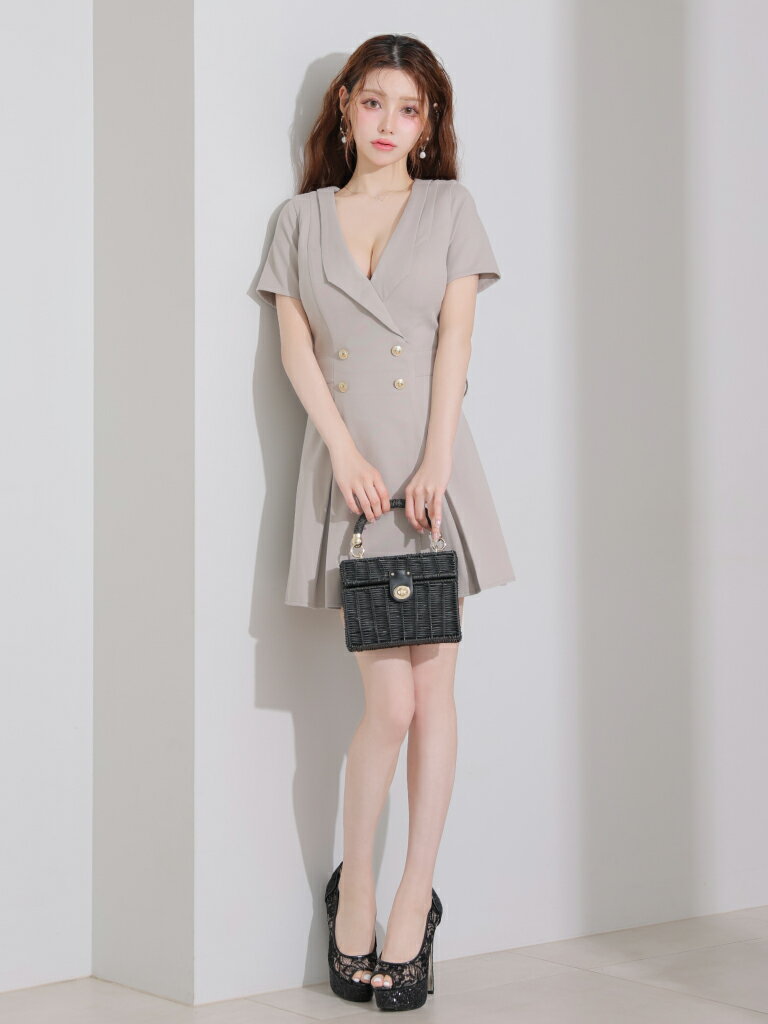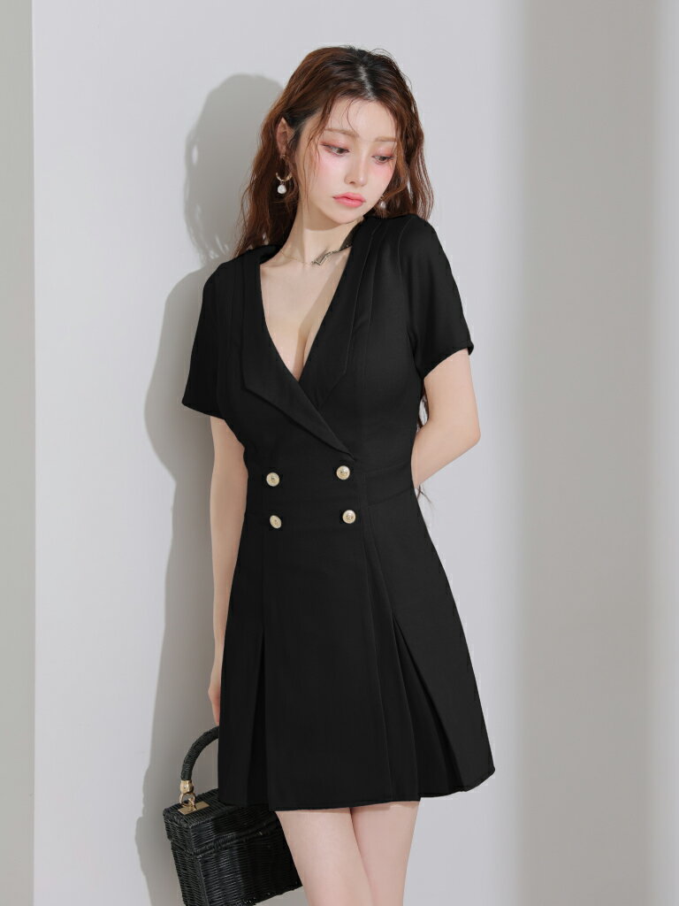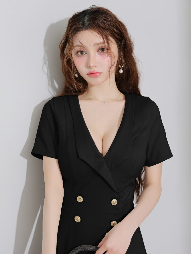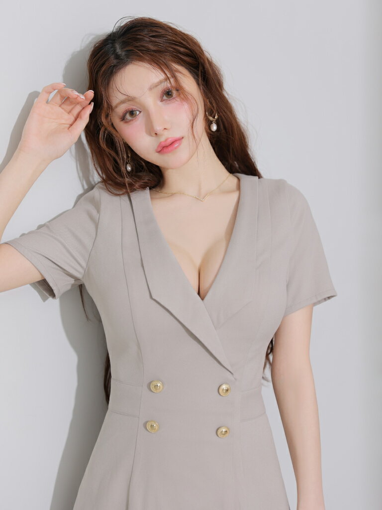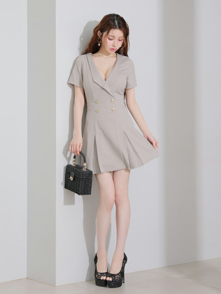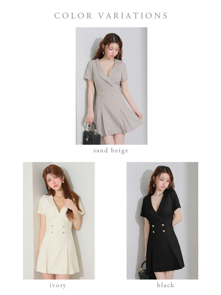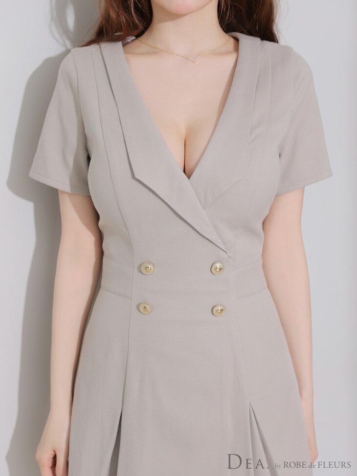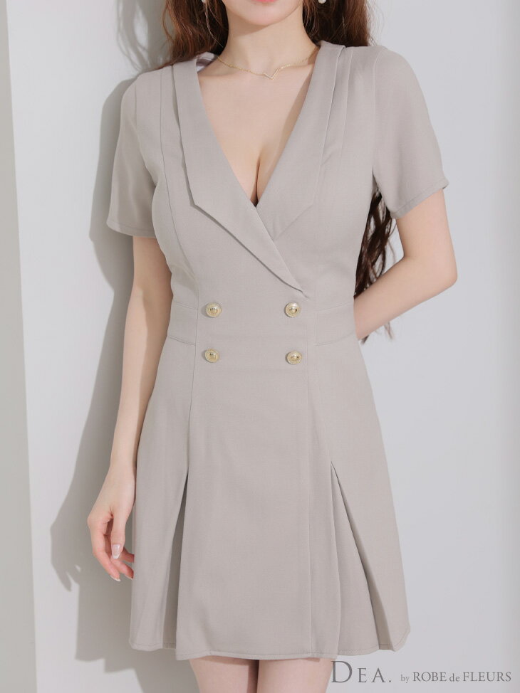 【DEA. by ROBE de FLEURS/ディアバイローブドフルール】ツイル/ 襟付き/ Vネック/ ボタン/ 半袖/ ボックスプリーツ/ フレア/ ミニドレス/ キャバドレス/ ワンピース [DE4207] ローブド ナイトドレス パーティー Aライン シンプル 袖あり Lサイズ XSサイズ ブラ着用可