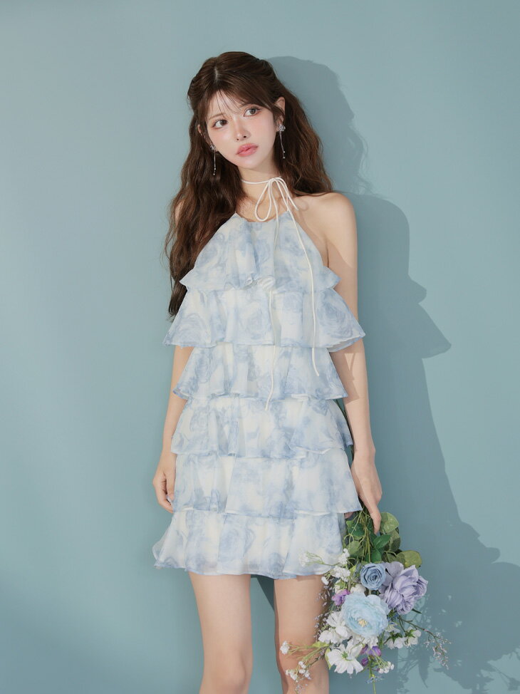 【予約】【ROBE de FLEURS / ローブドフルール】フラワー/ シフォン/ ティアード/ フリル/ 背中あき/ 編み上げ/ ホルターネック/ フレア/ ミニドレス/ キャバドレス / ワンピース/ ドレス [fm4502] 可愛い 人気 韓国 ノースリーブ Aライン ナイトドレス ミニワンピ ふわふわ