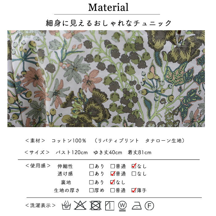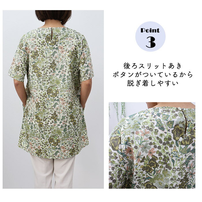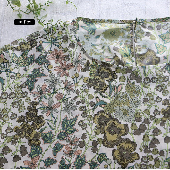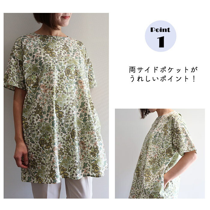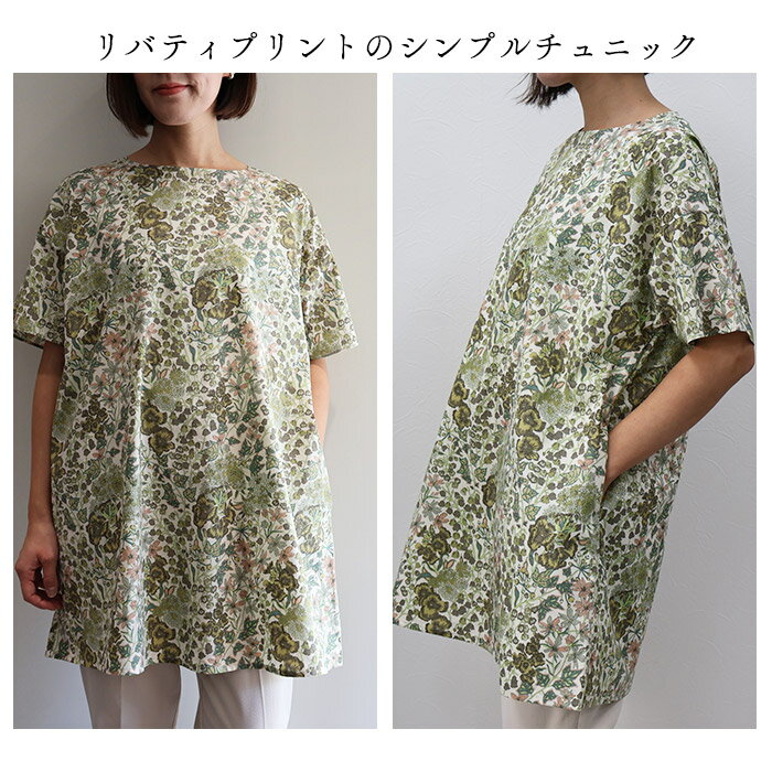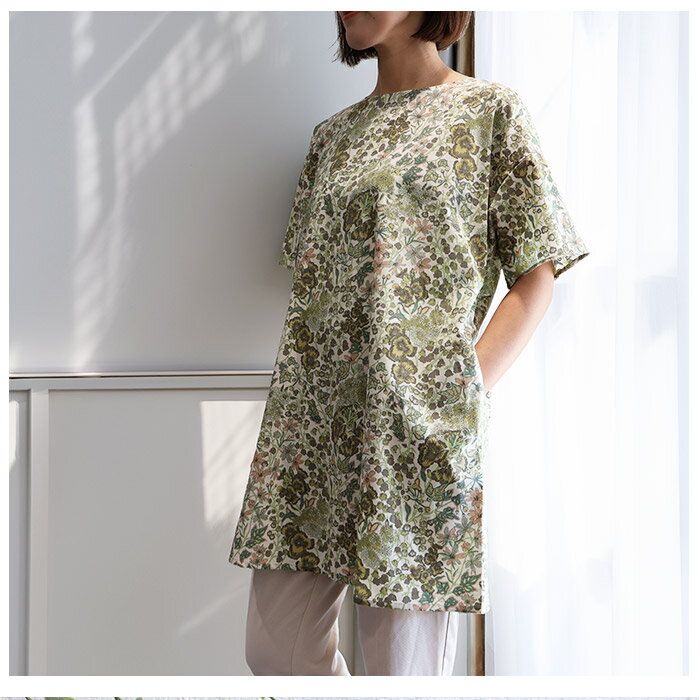 リバティプリント 半袖チュニック(エドナ)グリーン系 Lサイズ ブラウス チュニック プリオーバー ポケット付 母の日 プレゼント LIBERTYPRINT使用