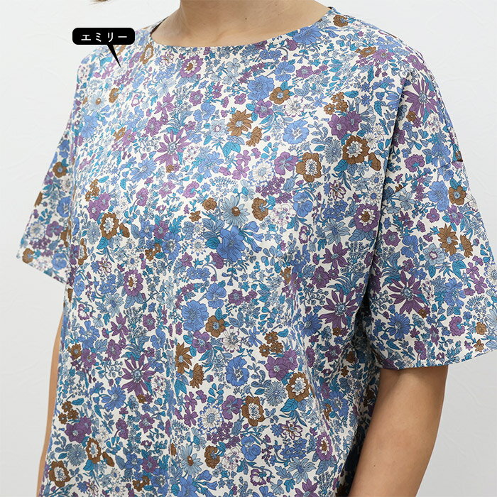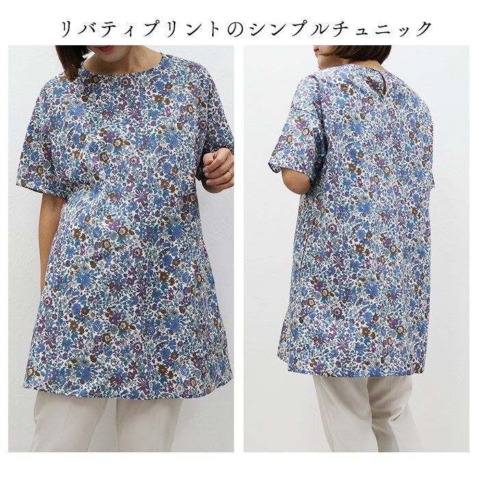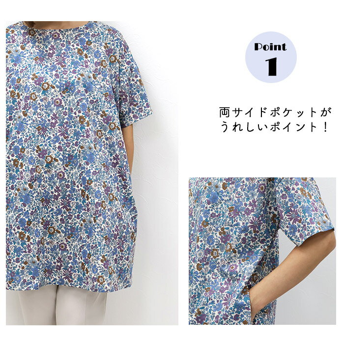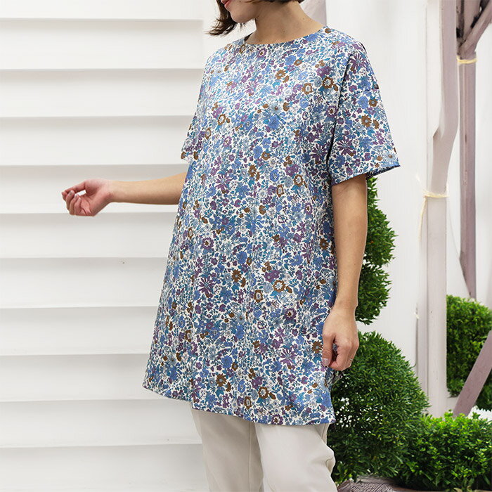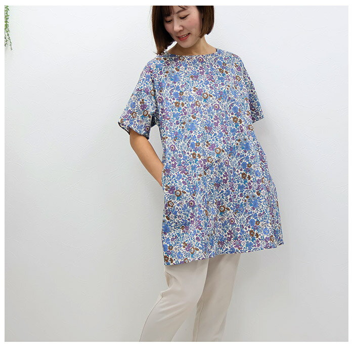 リバティ 半袖チュニック(エミリー)ブルー系 Lサイズ ブラウス チュニック 体型カバー リラックス ポケット付 母の日 プレゼント 国産