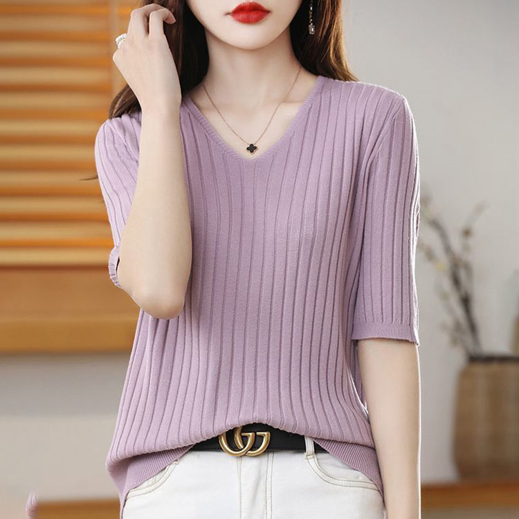 ニット レディース サマーニット ニット トップス セーター ニットトップス リブニット 5分袖 ニットtシャツ インナー 春 夏 秋 サマー vネック 半袖 キレイめ 薄手 シンプル 韓国ファッション カジュアル 通勤 通学 部屋着 お洒落