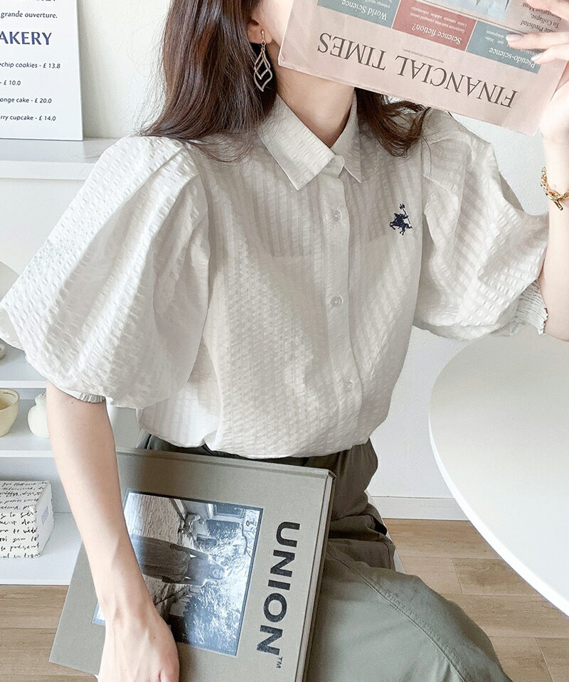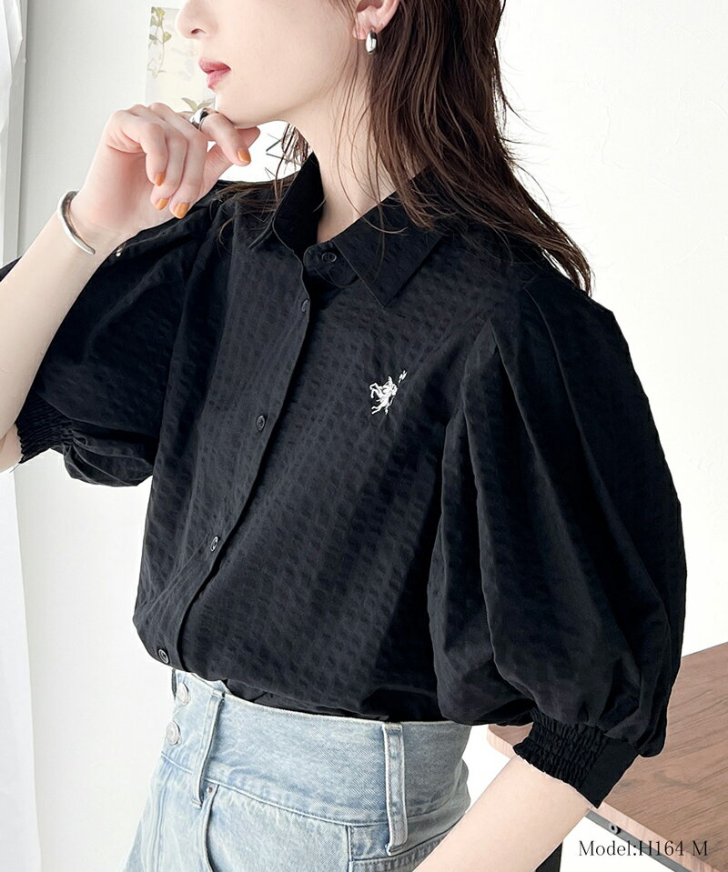 送料無料 トップス シャツ レディース タック入り たっぷり ボリューム スリーブ 胸 ワンポイント 刺繍 入り 凸凹 爽やか 綿混 サッカー ブラウス デイリー オフィス 着回し 高見え 大きいサイズ 春 夏 2024ss クラシカルエルフ ce1020139