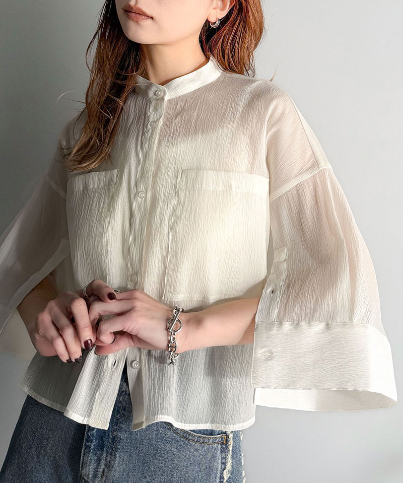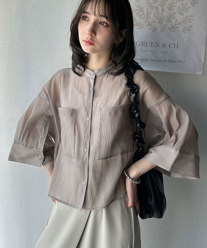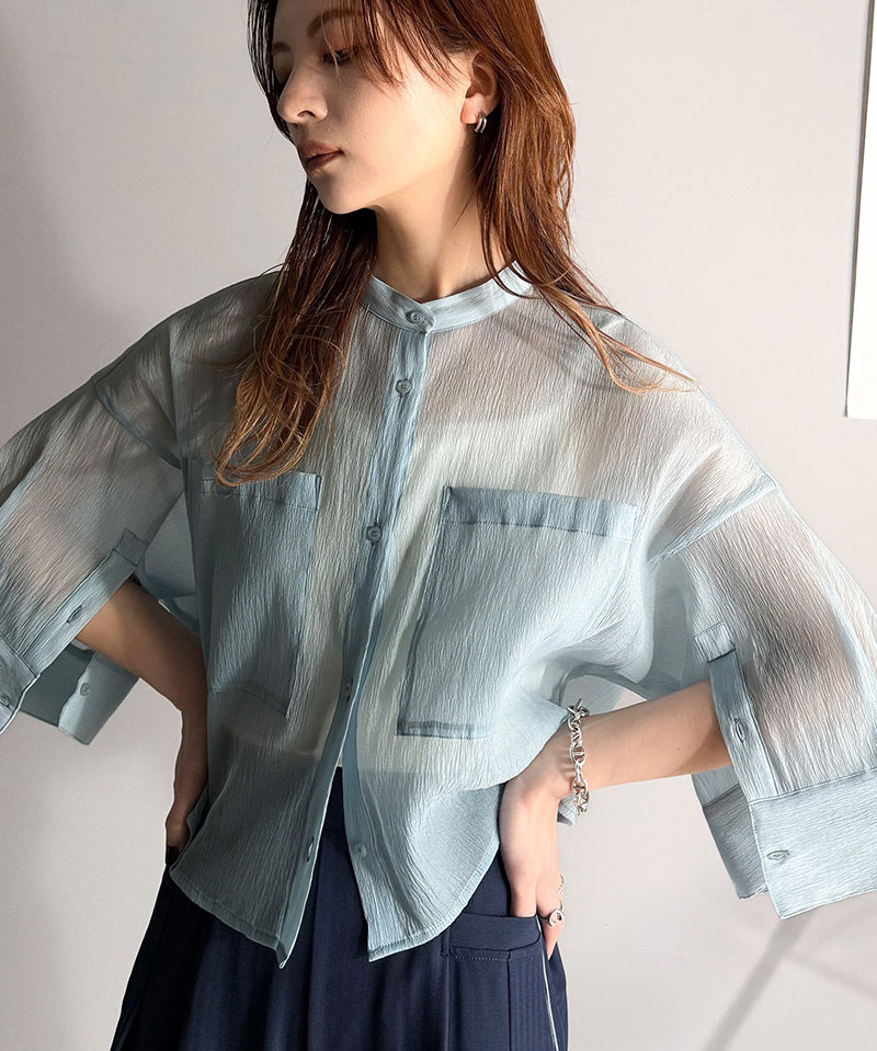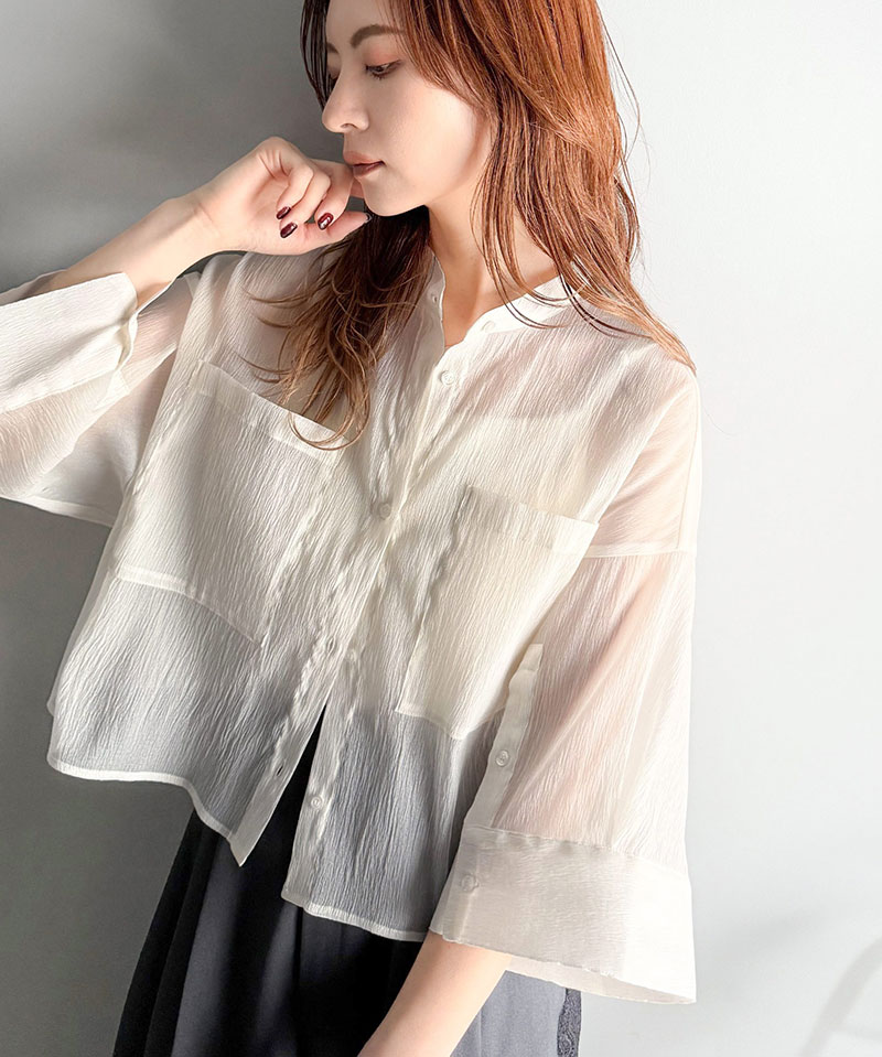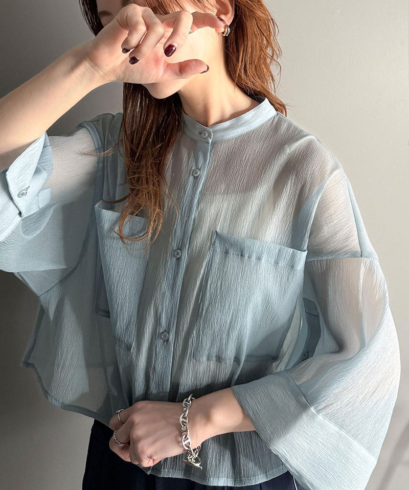 今ならまとめ買い3点以上で10%OFF 送料無料 レディース トップス シャツ/ブラウス シアーバンドカラー ショートシャツ 半袖 ワイドスリーブ ダブルポケット 透け感 シアーシャツ こなれ感 冷房対策 2025ss 春 夏 クラシカルエルフ ce1110098