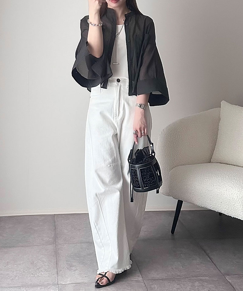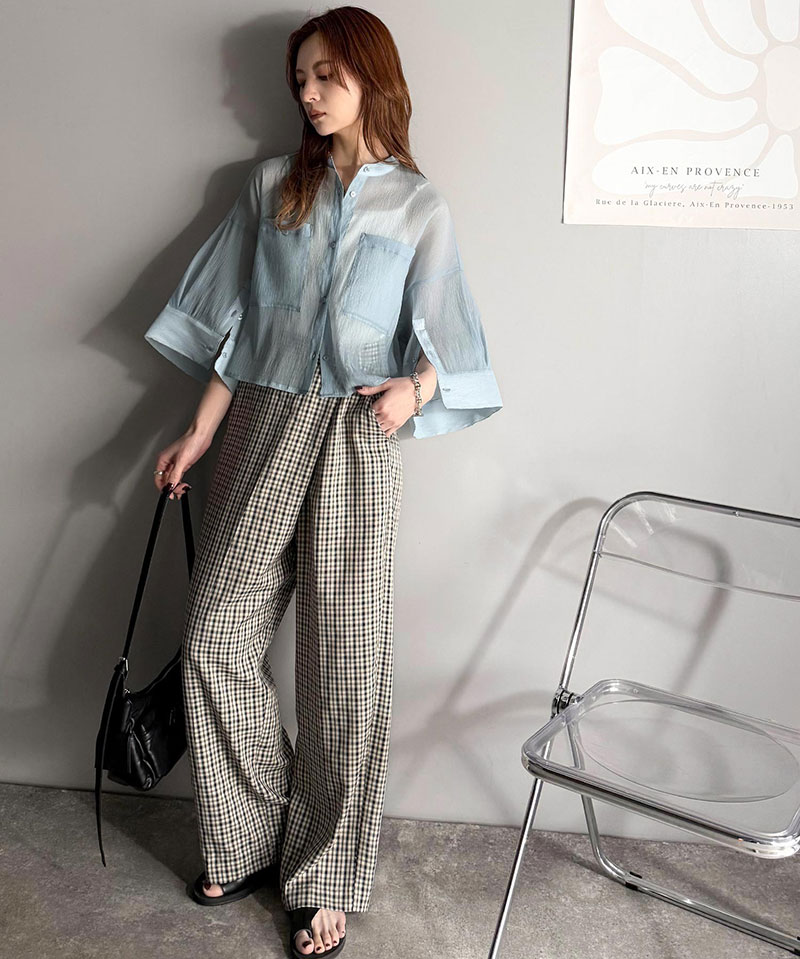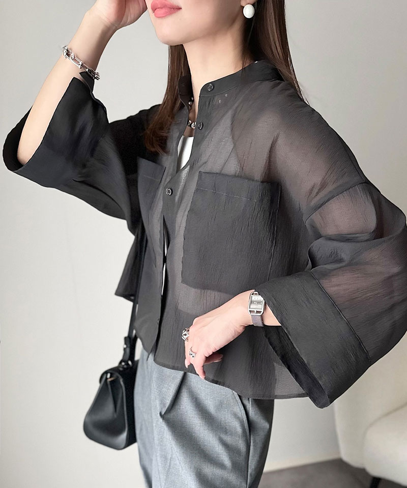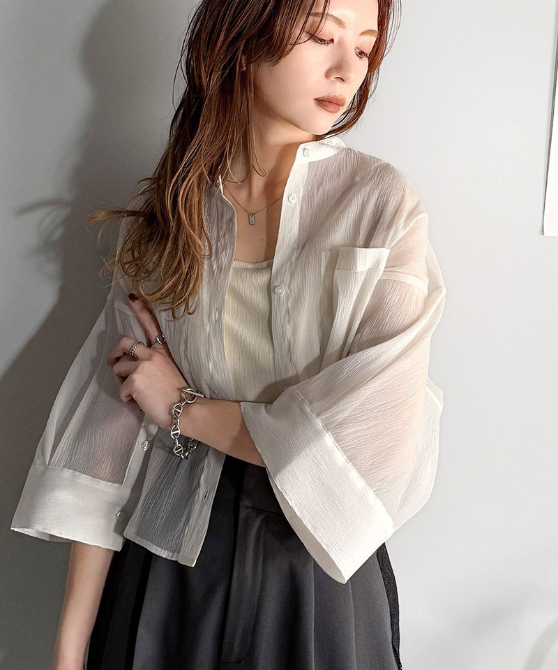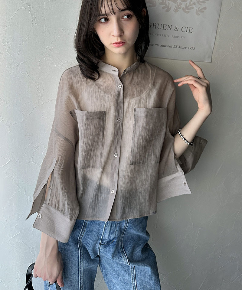 今ならまとめ買い3点以上で10%OFF 送料無料 レディース トップス シャツ/ブラウス シアーバンドカラー ショートシャツ 半袖 ワイドスリーブ ダブルポケット 透け感 シアーシャツ こなれ感 冷房対策 2025ss 春 夏 クラシカルエルフ ce1110098