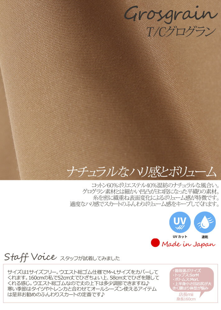 【 日本製 】 スカート ひざ丈 膝丈 ミモレ丈 ひざ下 ゴム フリーサイズ 夏 秋 春 オールシーズン 綿 コットン ウエストゴムスカートフレアスカート グログラン ギャザー フリーサイズ 背が低い オフィス 【総ゴムギャザースカート】<7235g>