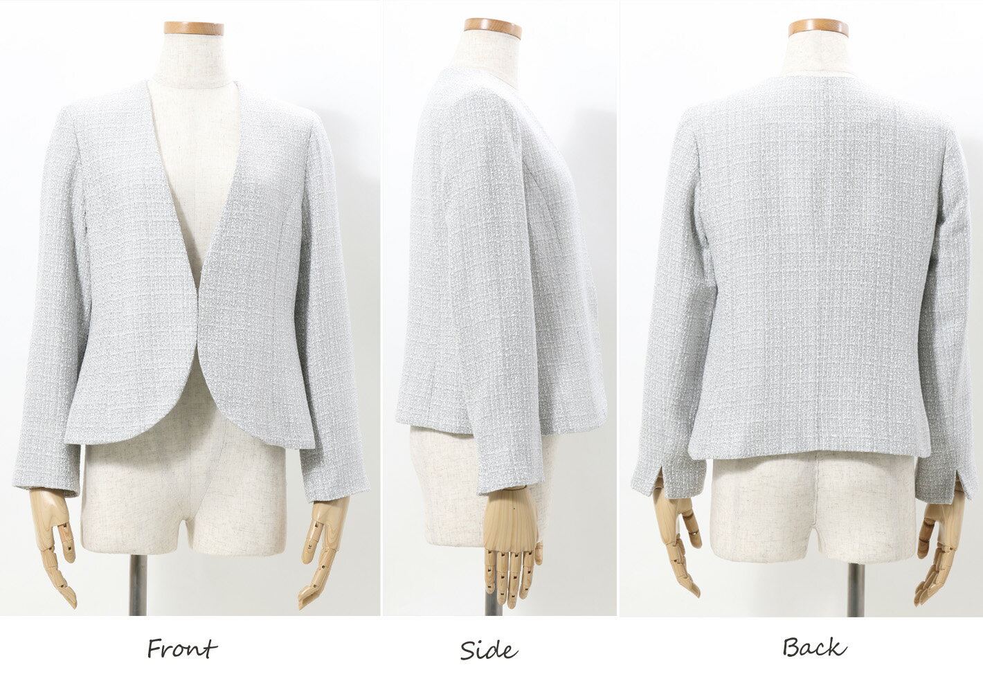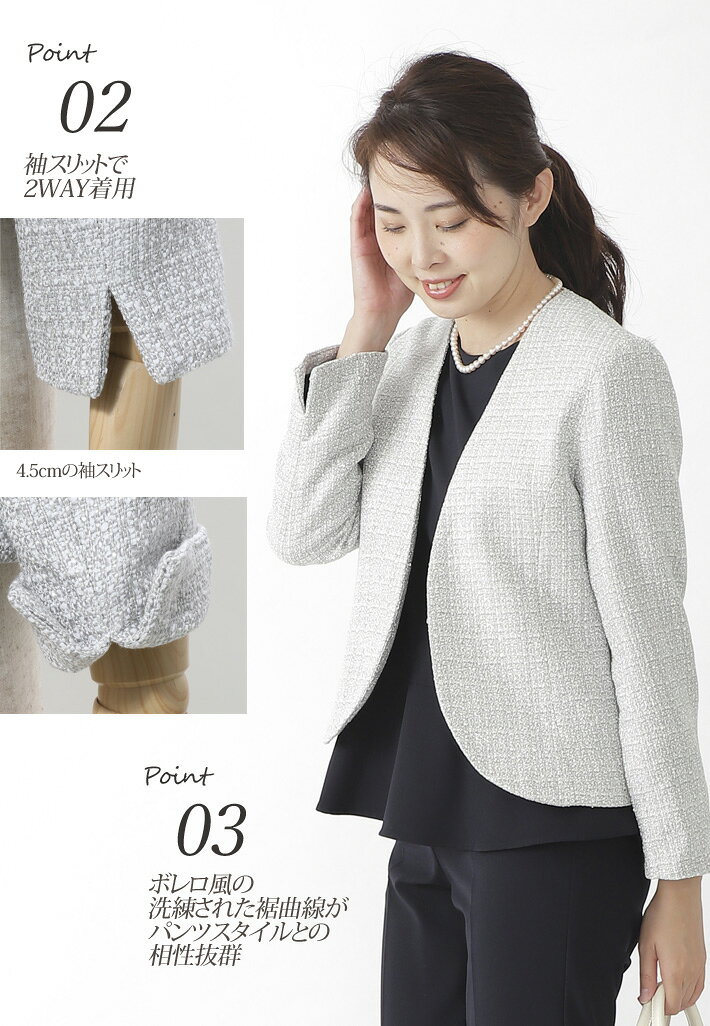 【 日本製 】 ツイード ジャケット レディース ノーカラー カラーレス ボレロ セットアップ 卒業式 30代 40代 顔合わせ 母親 服装 50代 入学式 ママ スーツ 母 フォーマル 秋冬 春 きれいめ 大きいサイズ 七五三 お宮参り 結婚式 尾州 【MIXツイードボレロ風JK】<8023>