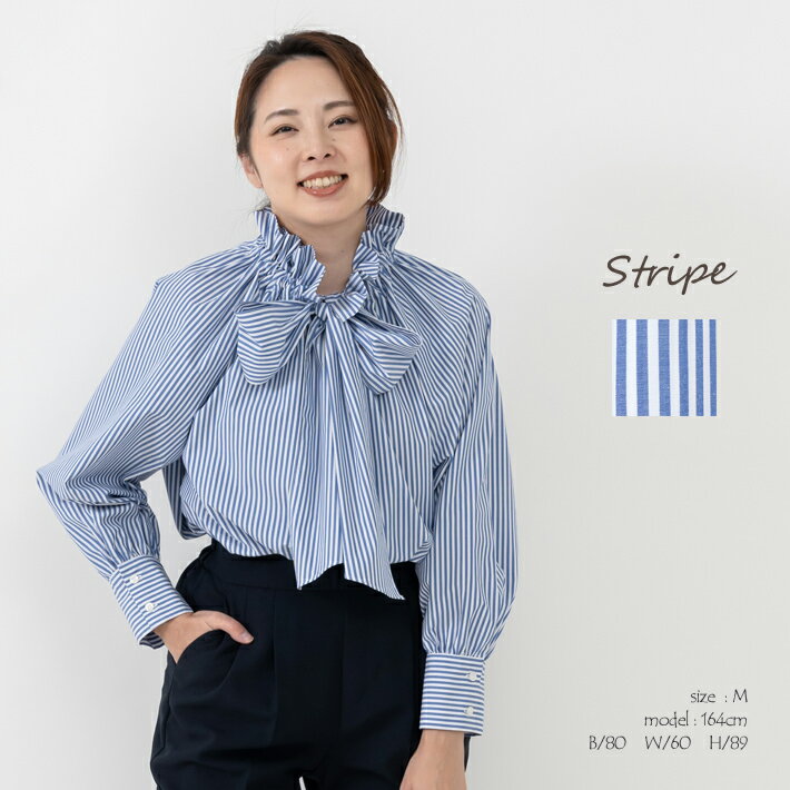 【 日本製 】 ブラウス ビッグリボン ビッグボウブラウス ボウタイ レディース 立ち襟 オーバーブラウス 秋 春 きれいめ フォーマル 白 ホワイト ストライプ 七五三 入学式 卒業式 スーツインナー お宮参り 演奏会 【リボン付きBL】<8036>