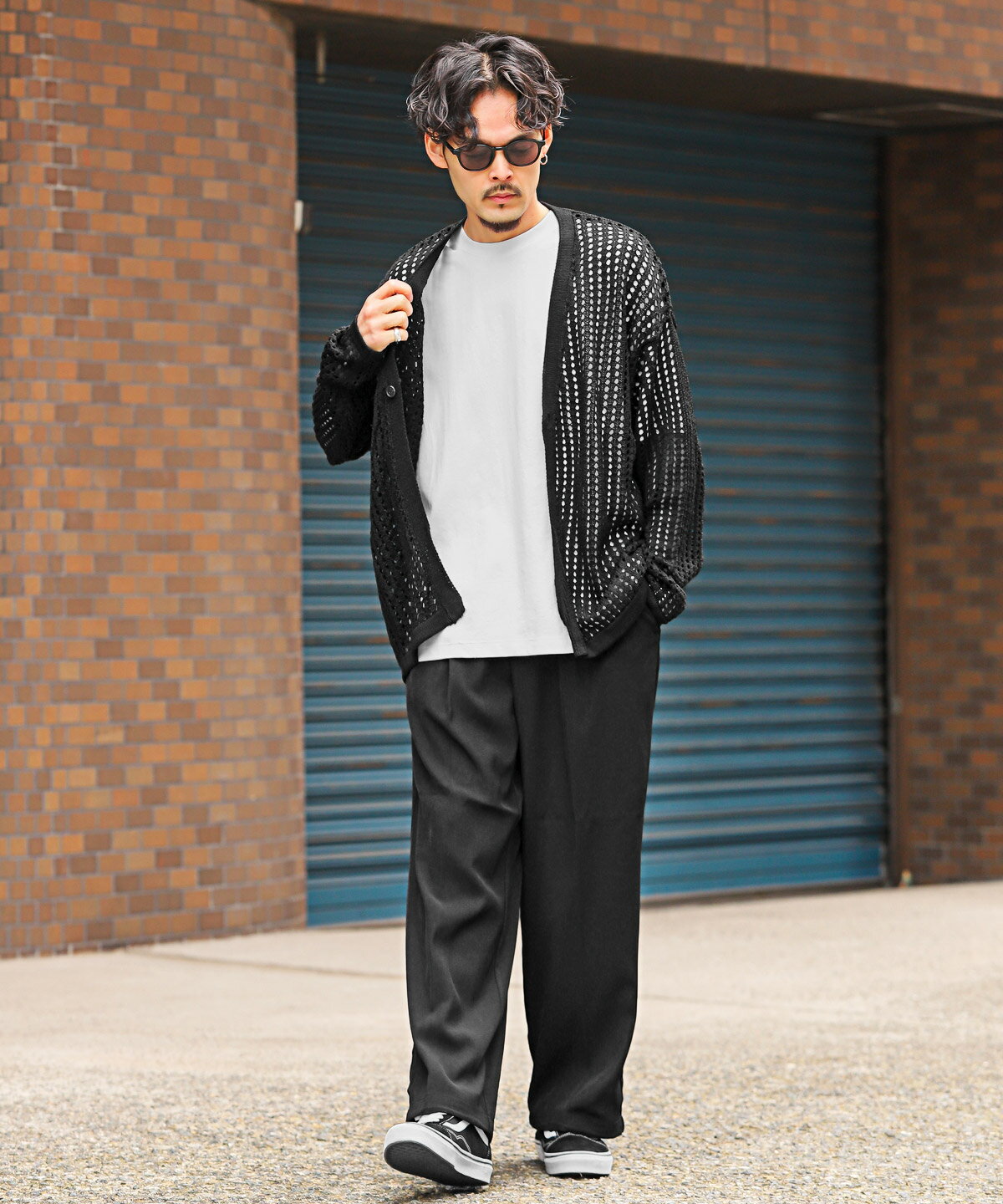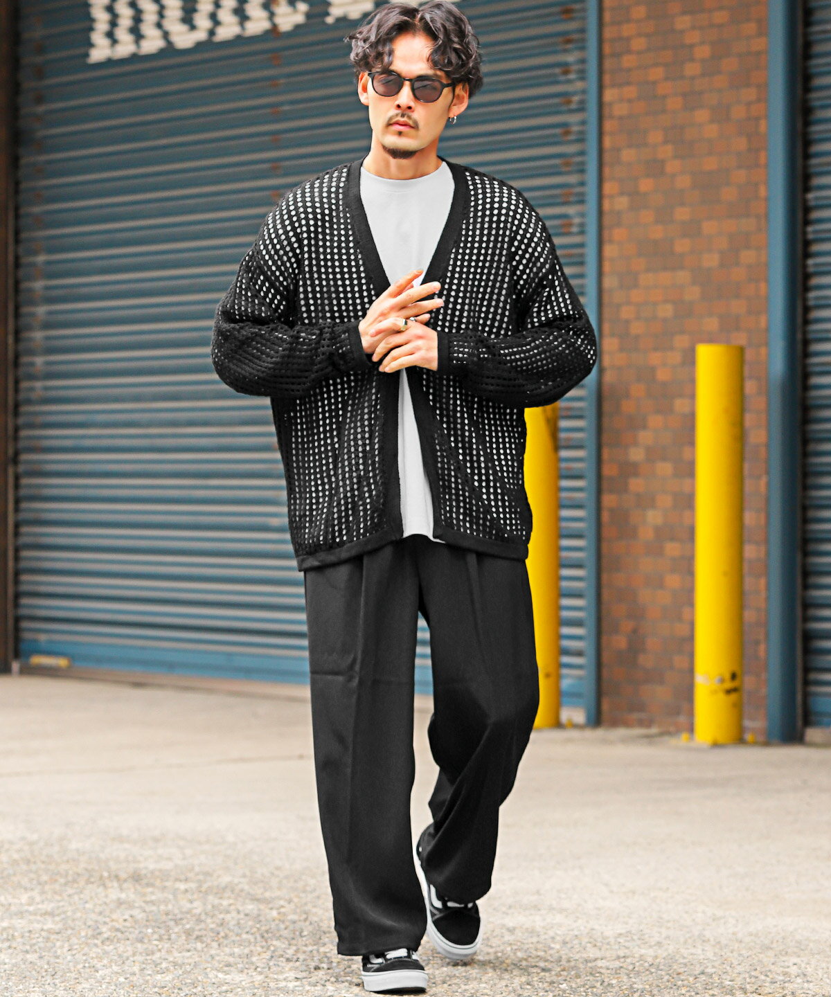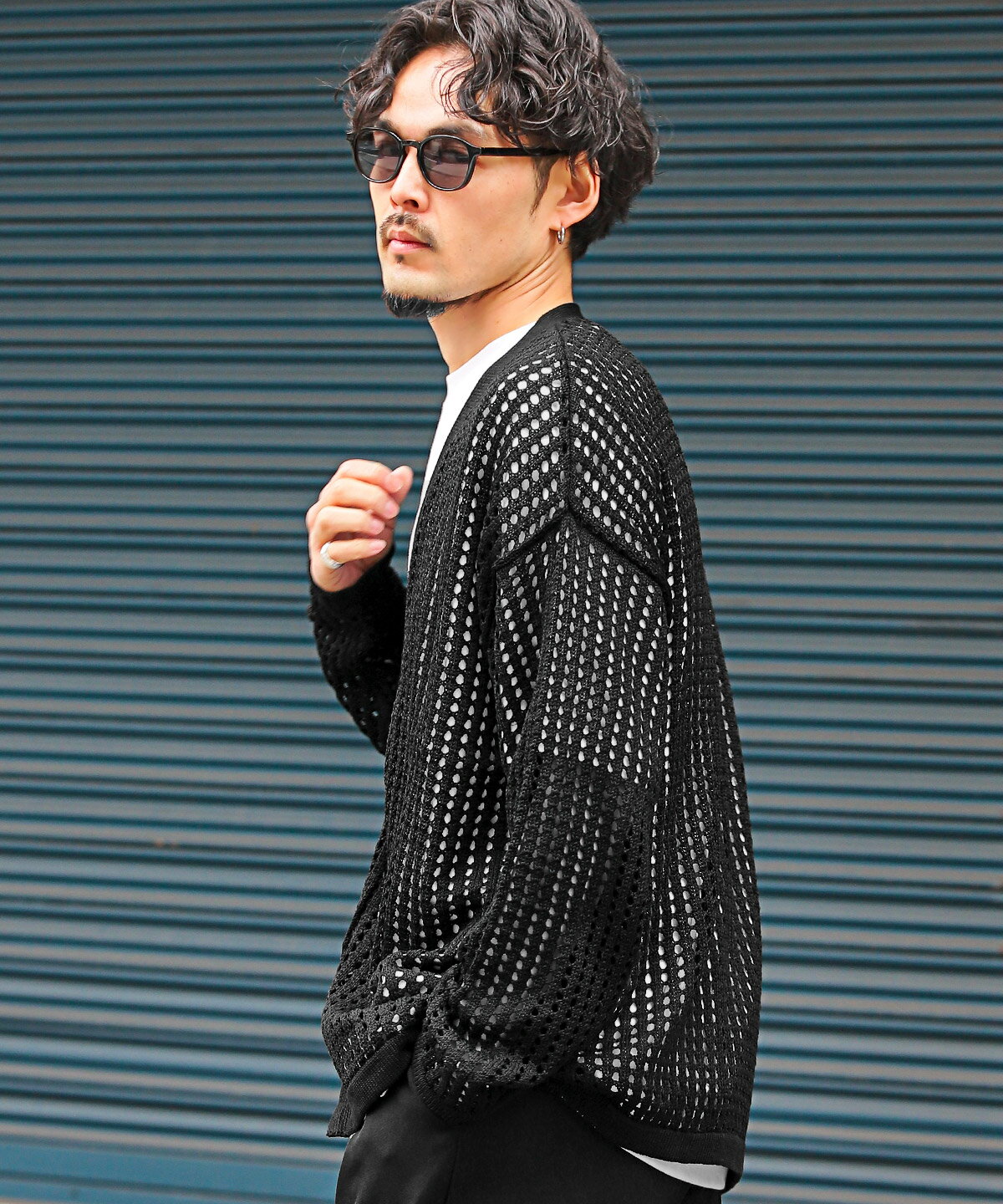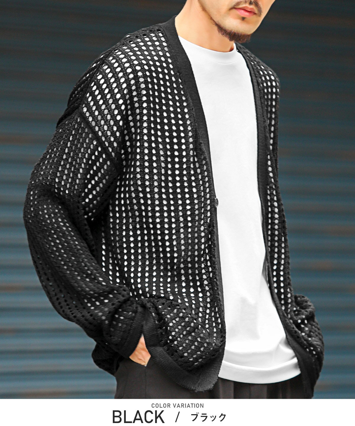 【7Gメッシュ編みオーバーサイズ1ボタンカーディガン】ニット カーデ 羽織り 透け感 7G ミドルゲージ モード シンプル キレイめ 男女兼用 ユニセックス カーディガン メンズ メッシュ オーバーサイズ 無地 ブラック 春 秋 aa-2999