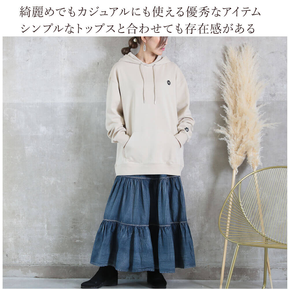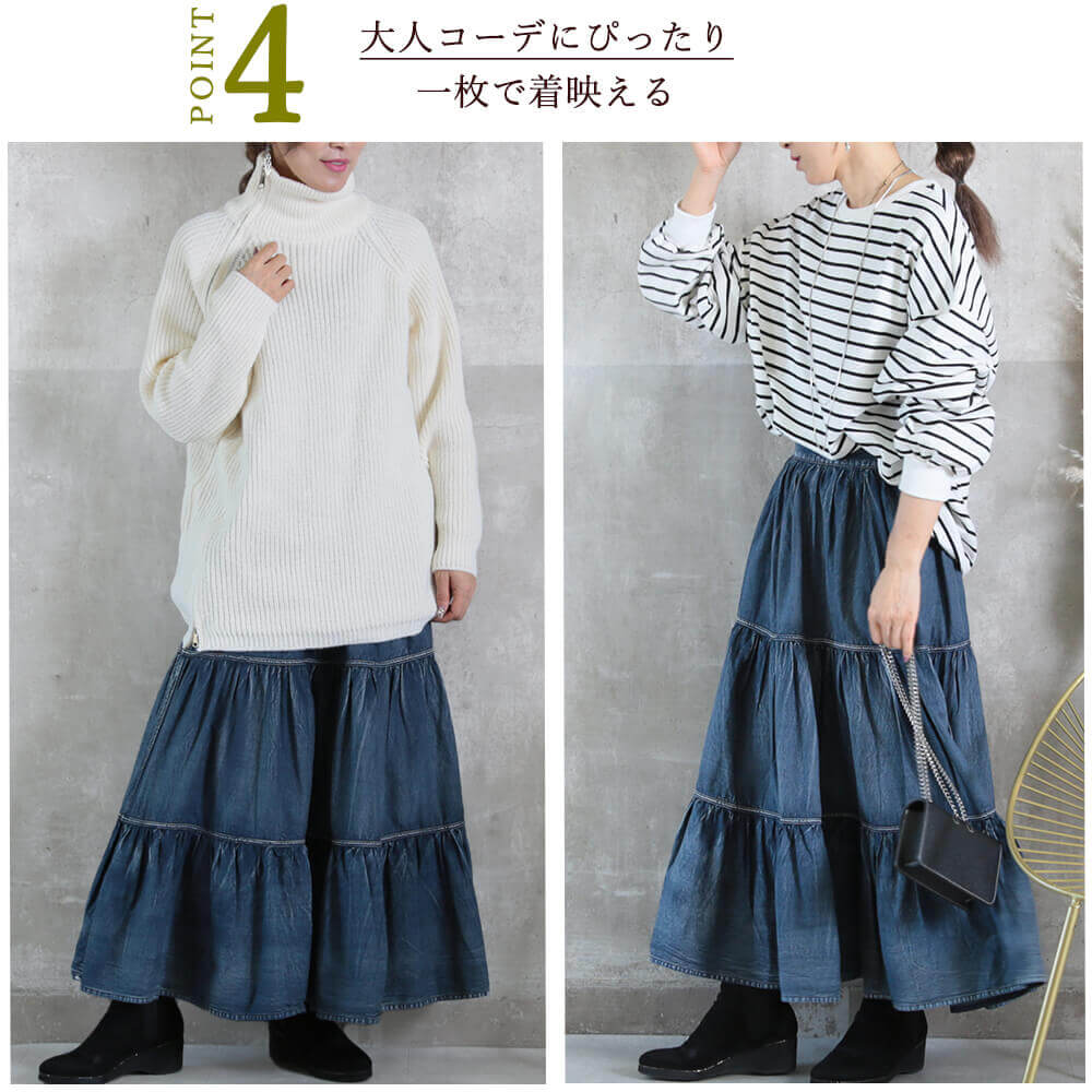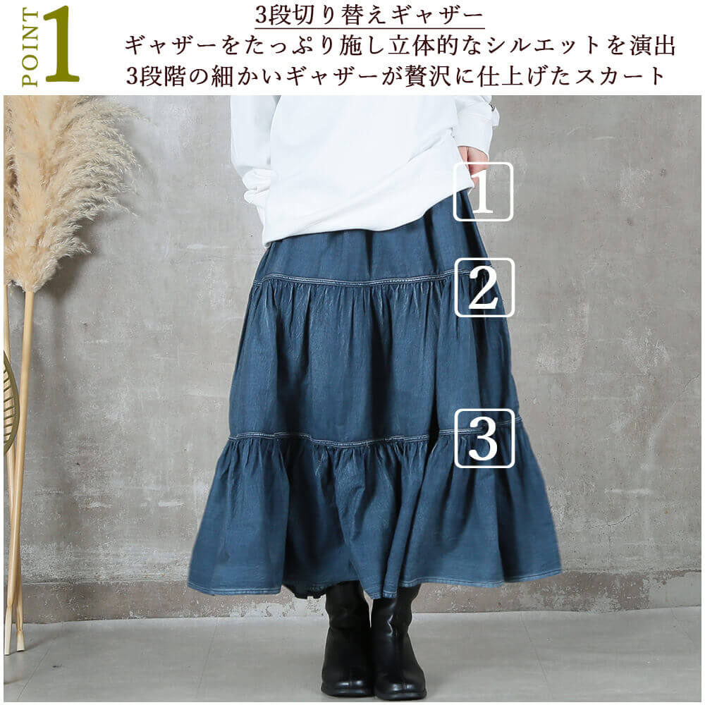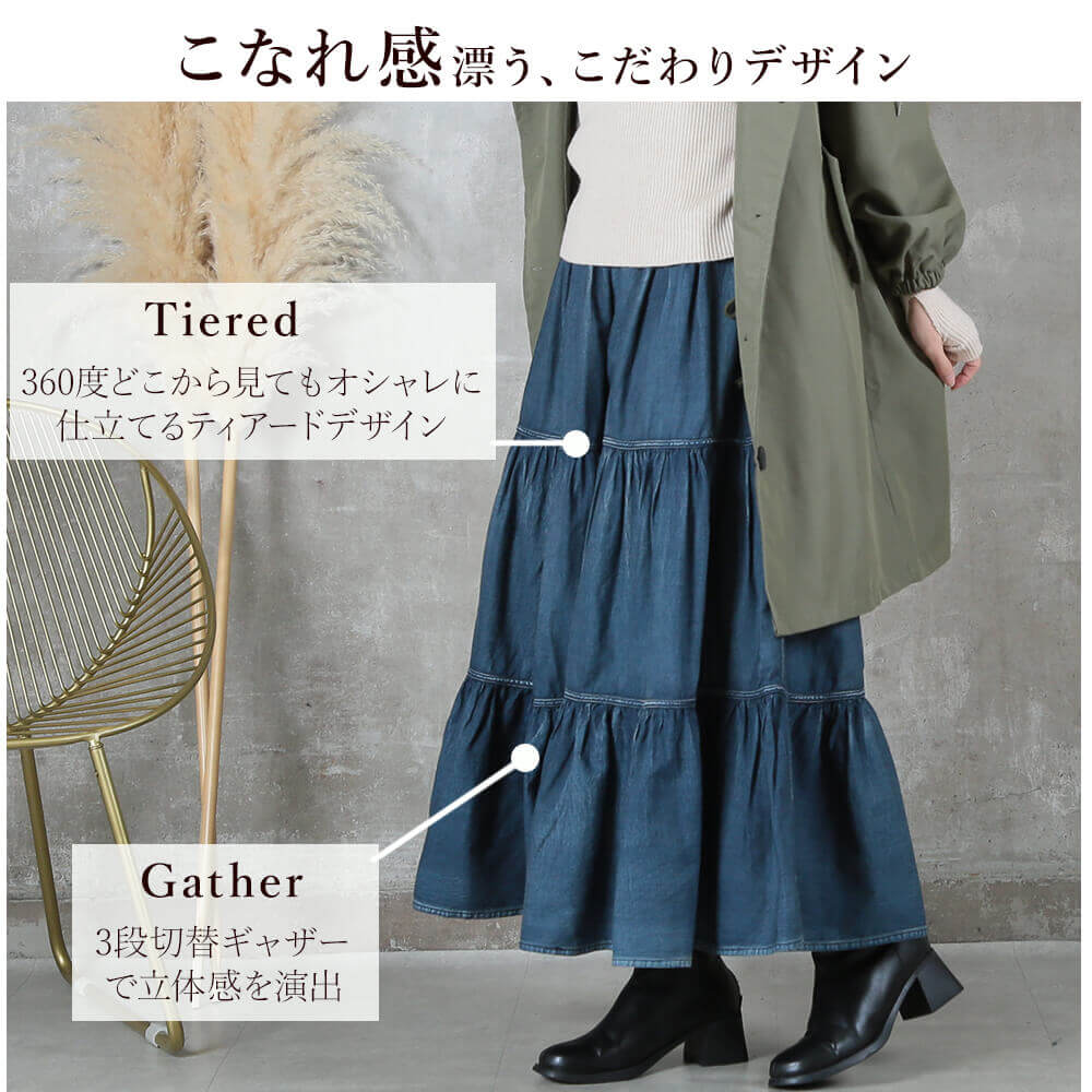<必見!45%クーポンで6589円!>即納 新常識。 デニム スカート 綿100 ティアードスカート ロング 大きいサイズ aライン フリル ウエストゴム 低 身長 レディース フレア マキシ 丈 ティアード ジーンズ マーメイド おしゃれ 切り替え ゆったり ギャザー 秋 綿100%