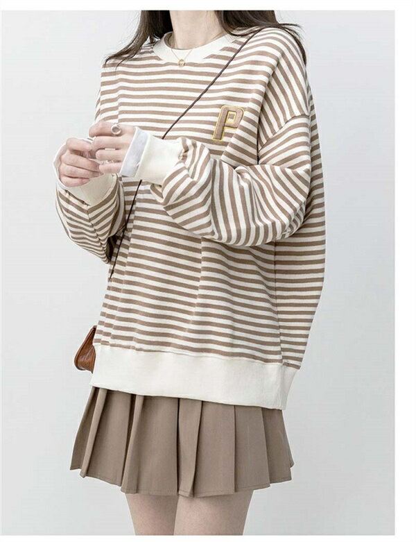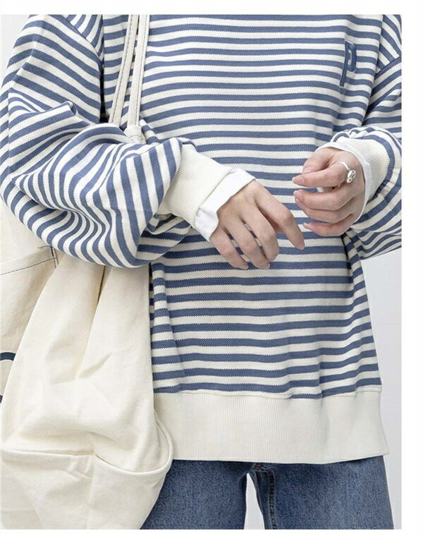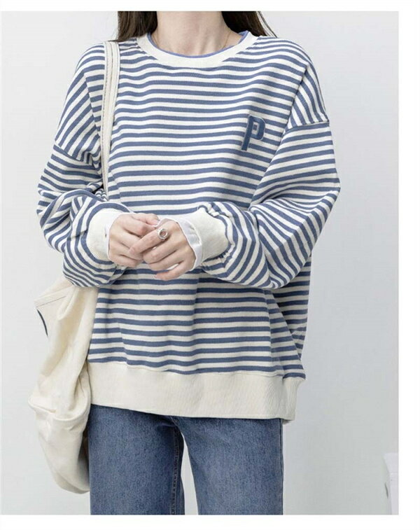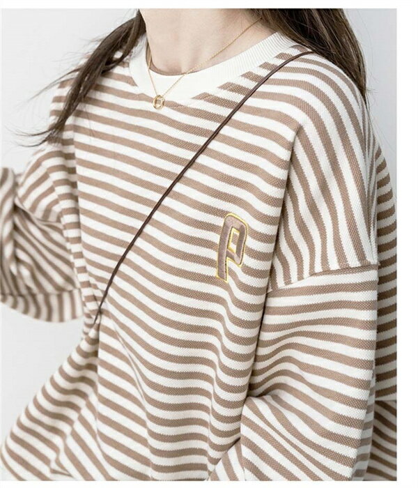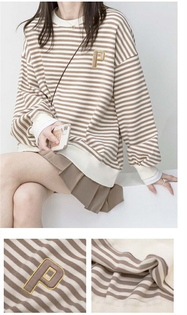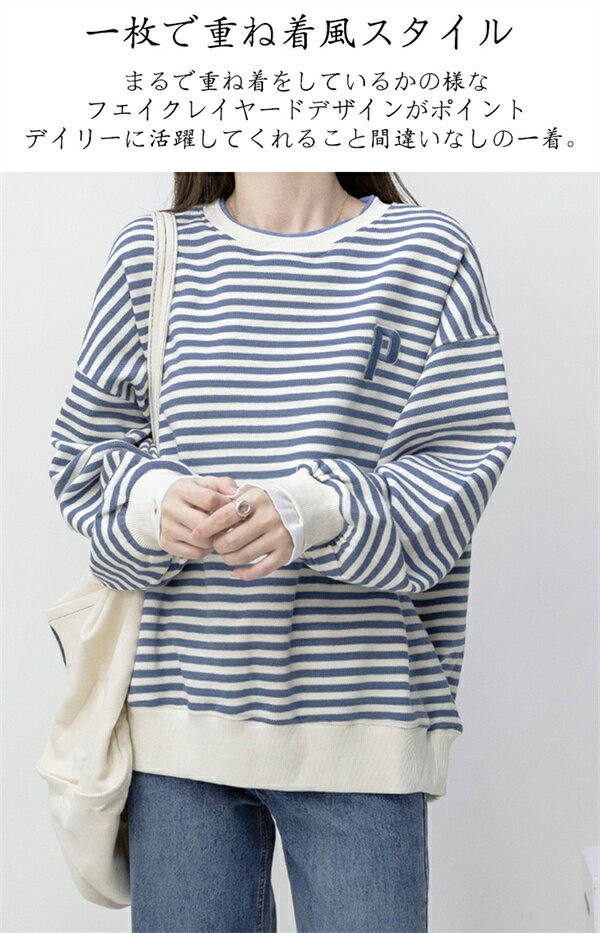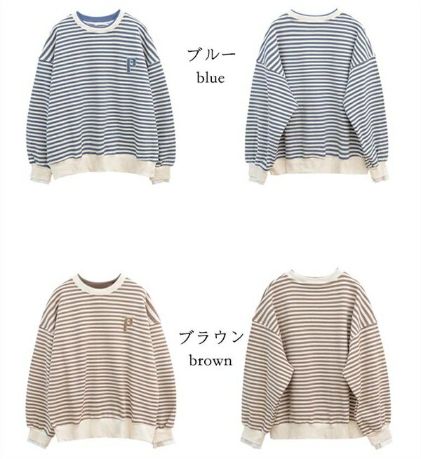 トップス レディース トレーナー ストライプ ドロップショルダー 春物 春秋 ロンT 大きいサイズ オーバーサイズ ゆったり シャツ 女性 Uネック 通勤 仕事 お出かけ 綿混素材 プルオーバー 長袖 ブラウン ブルー 送料無料