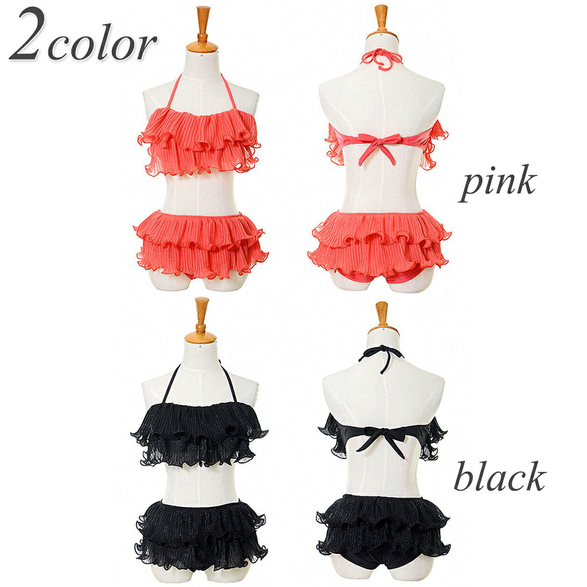 【18日限定P10倍】【セール特価 水着 レディース フリル ビキニ 女の子 ママ セパレート ピンク ブラック ラメ おしゃれ 2点セット 肩ひも ホルターネック 20代 30代 40代 リボン デザイン 大きいサイズ M L 9号 11号 旅行
